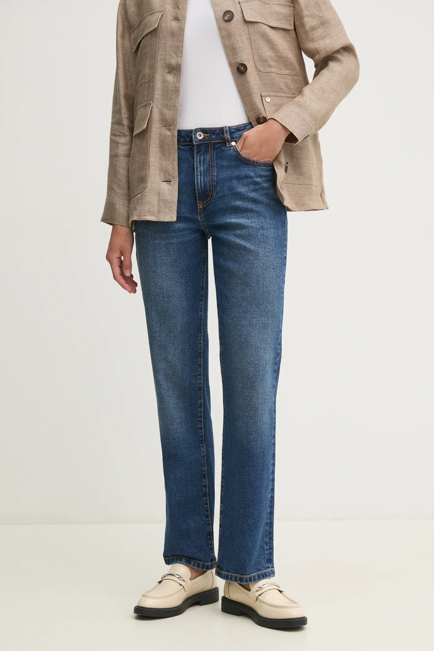 - Buzunare oblice și talie regulară