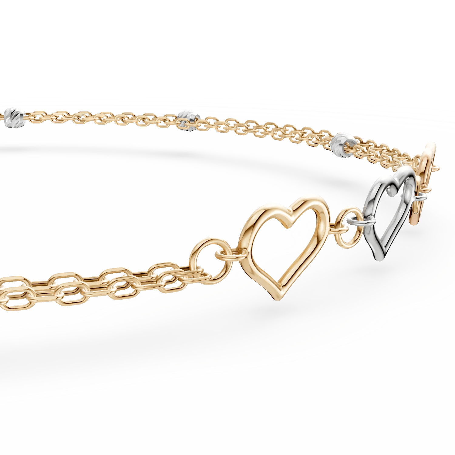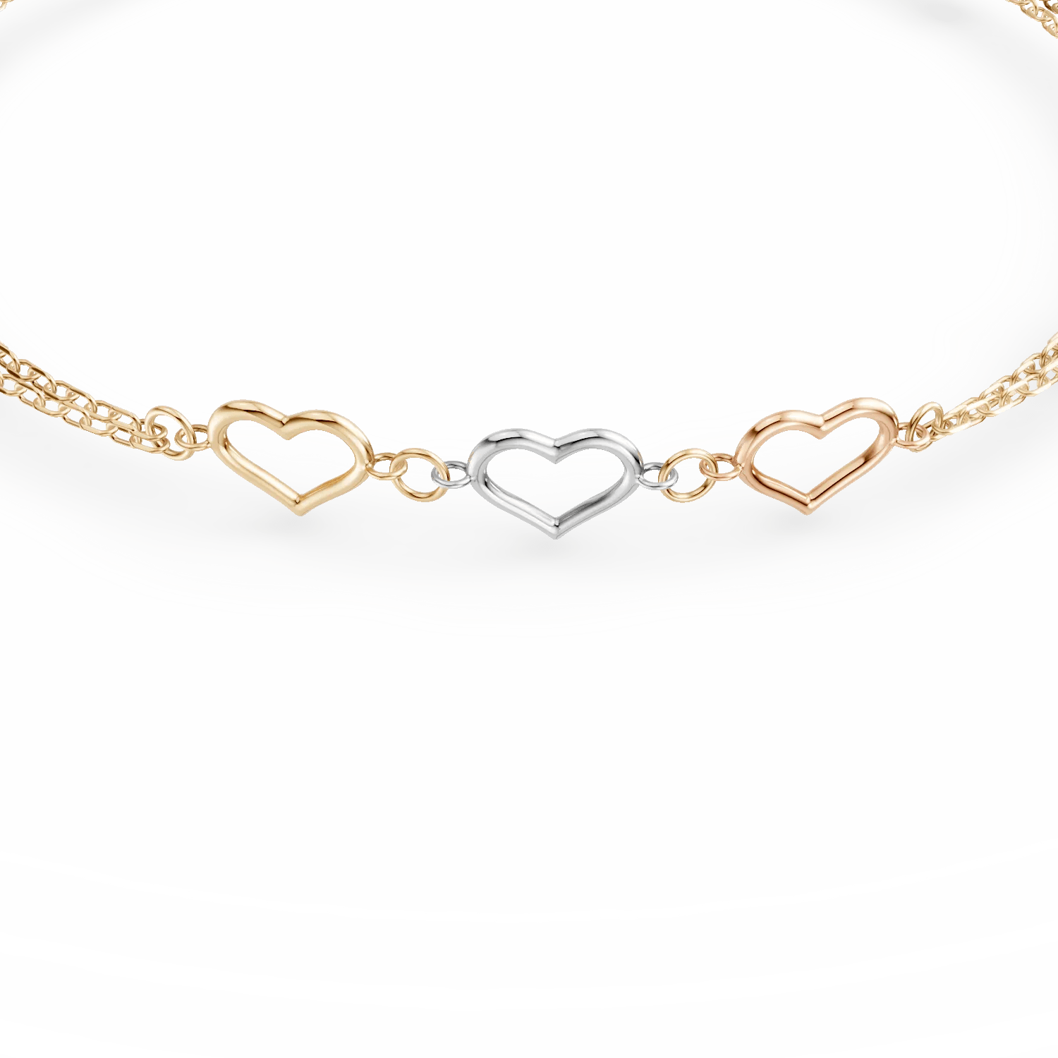 Această brățară cu inimioare, realizată din aur alb, roz și galben, combină eleganța metalului prețios cu un design simetric impresionant. Bijuteria adaugă o notă rafinată și strălucitoare universului tău.