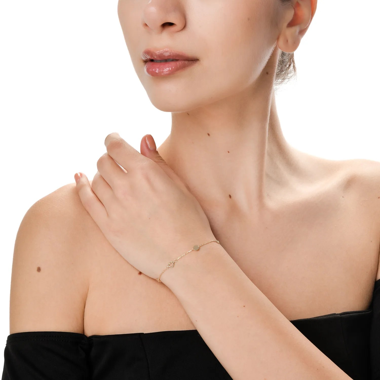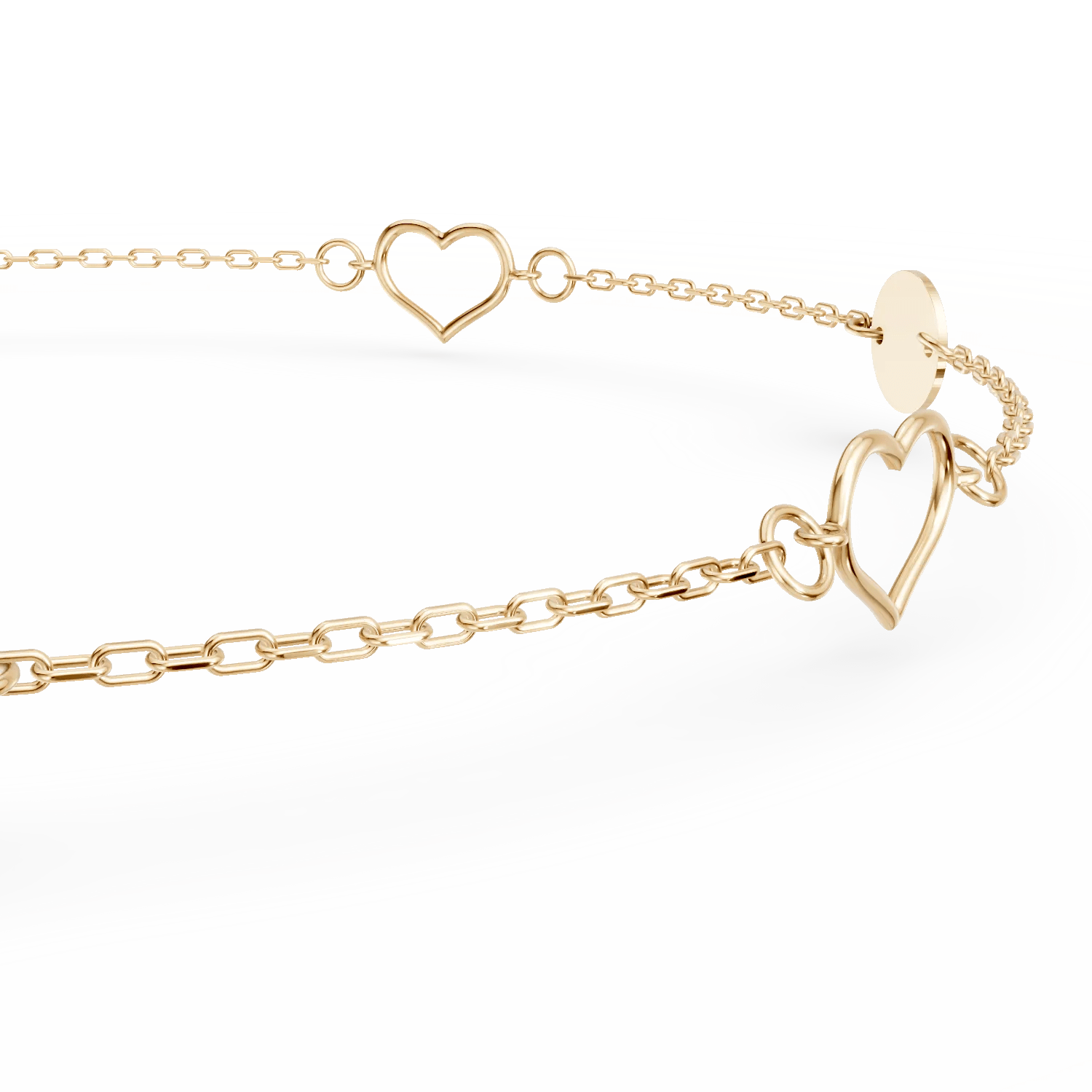 Acestă brățară cu inimioare din aur galben surprinde spiritul urban prin designul său captivant. O bijuterie specială care îți complimentează strălucirea personală.