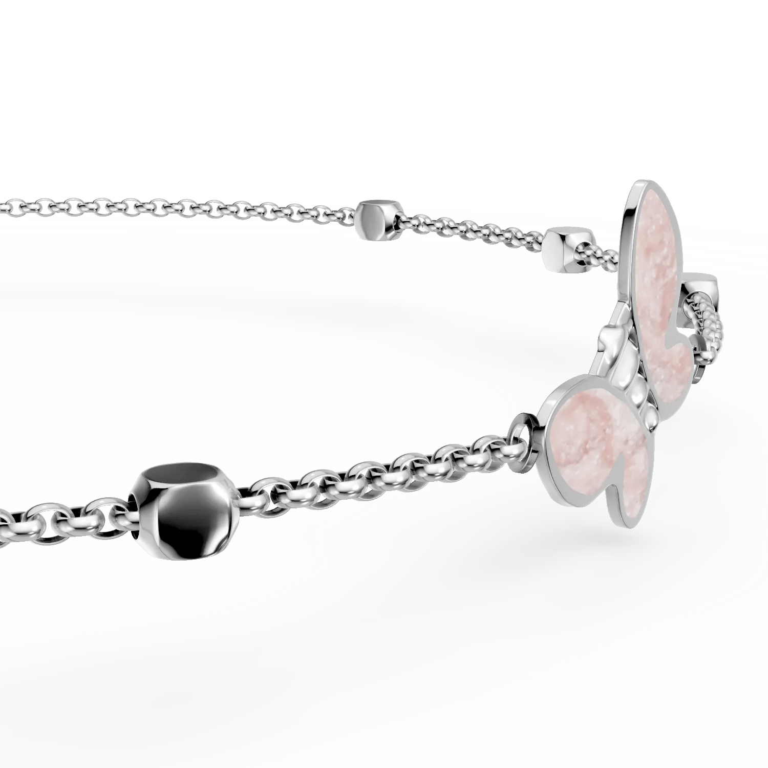 Brățara din aur alb impresionează prin designul său elegant, combinând biluțe delicate și un pandantiv fluture încântător. TEILOR îți oferă inspirația pentru a-ți accentua stilul în mod unic.