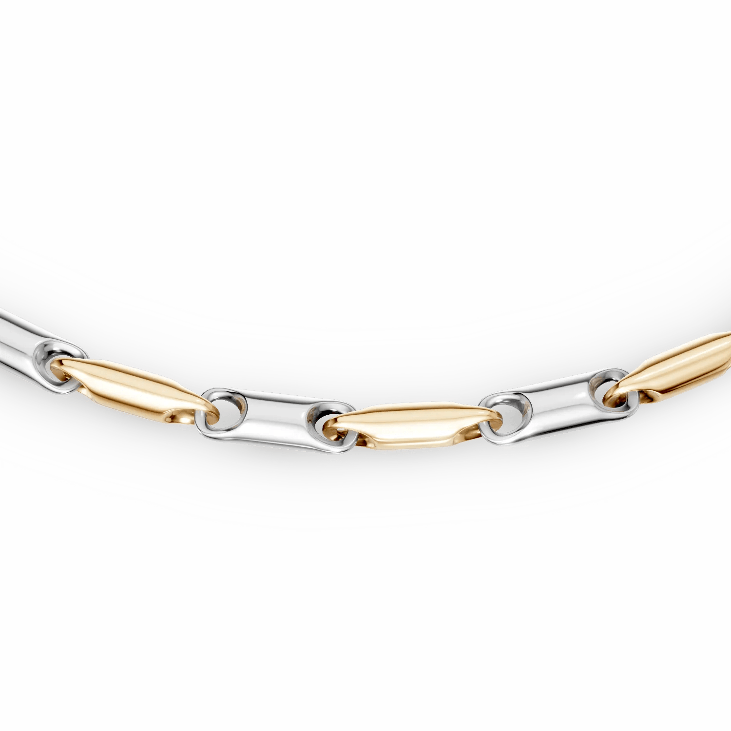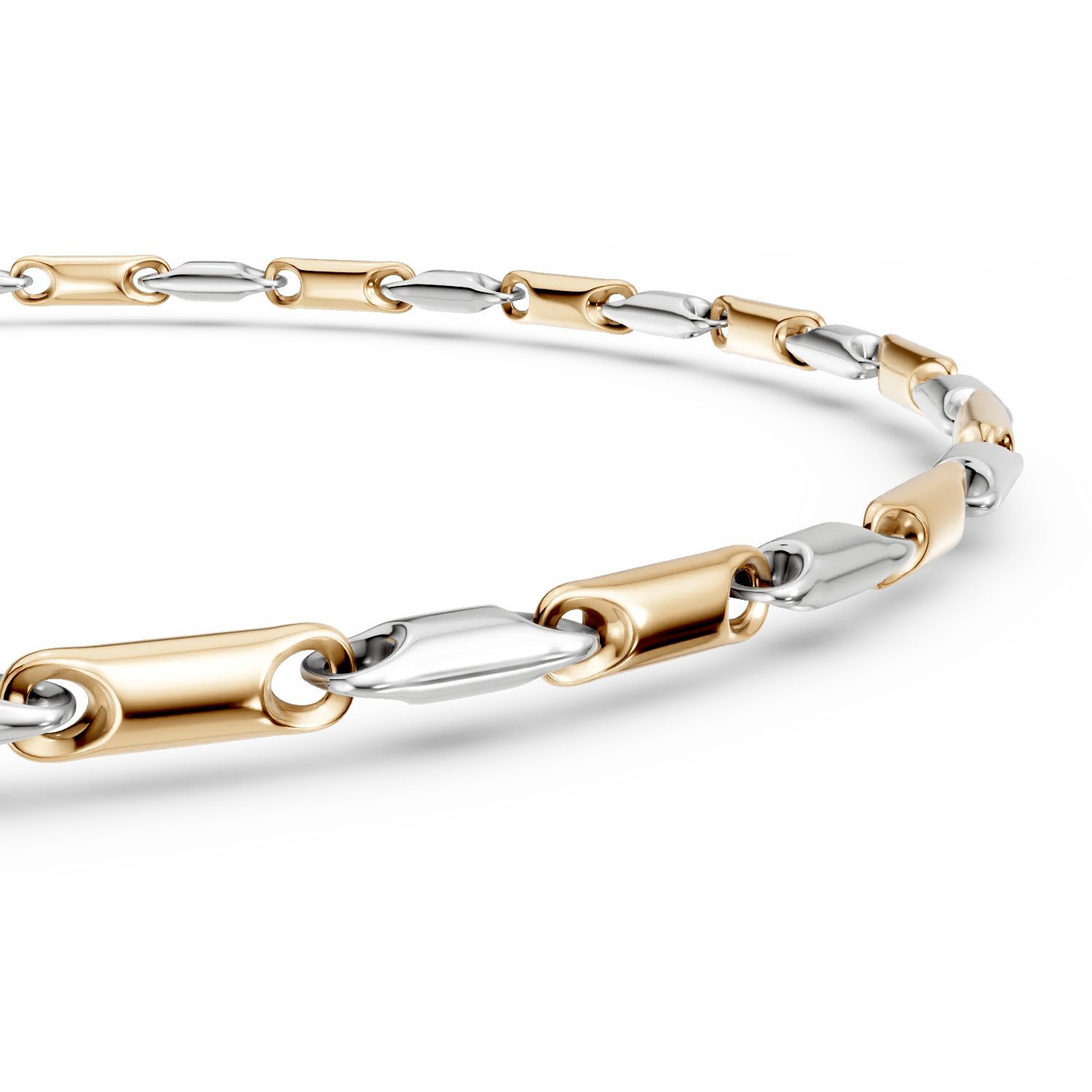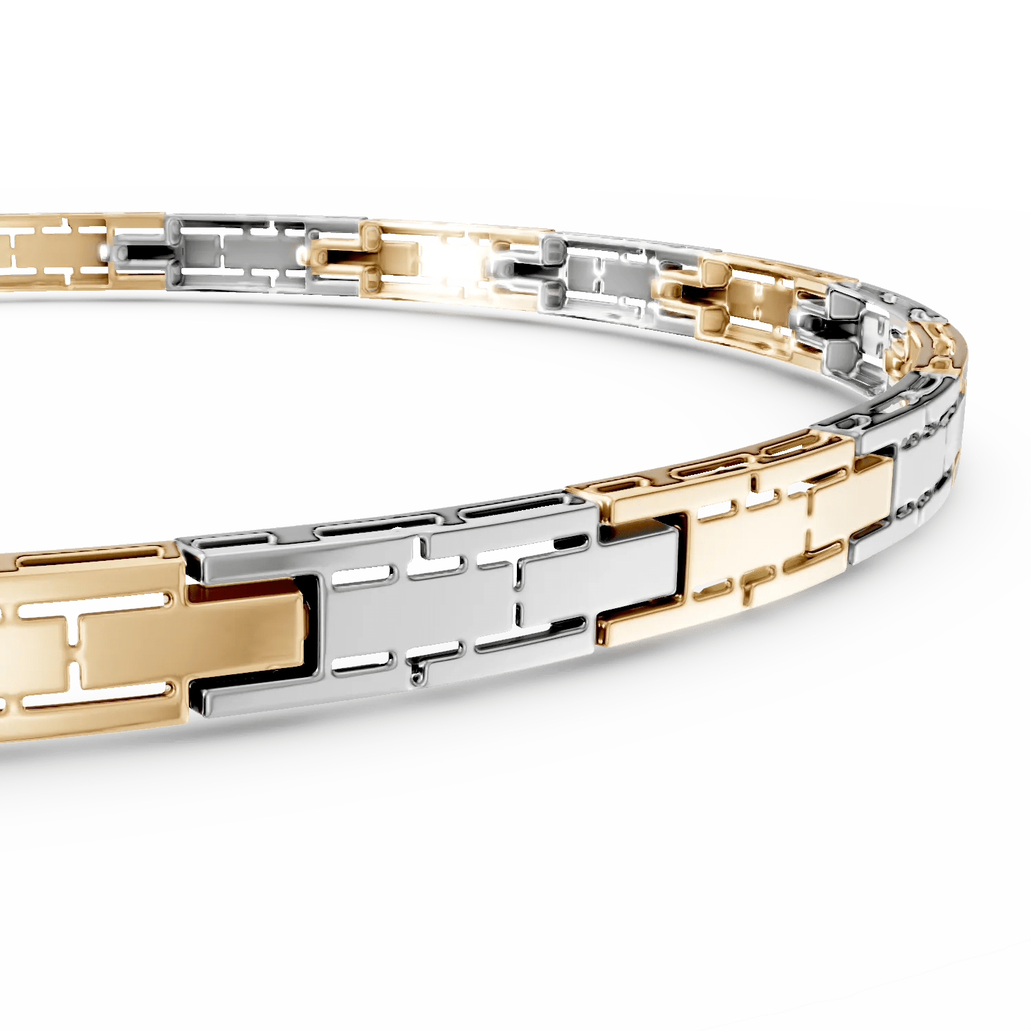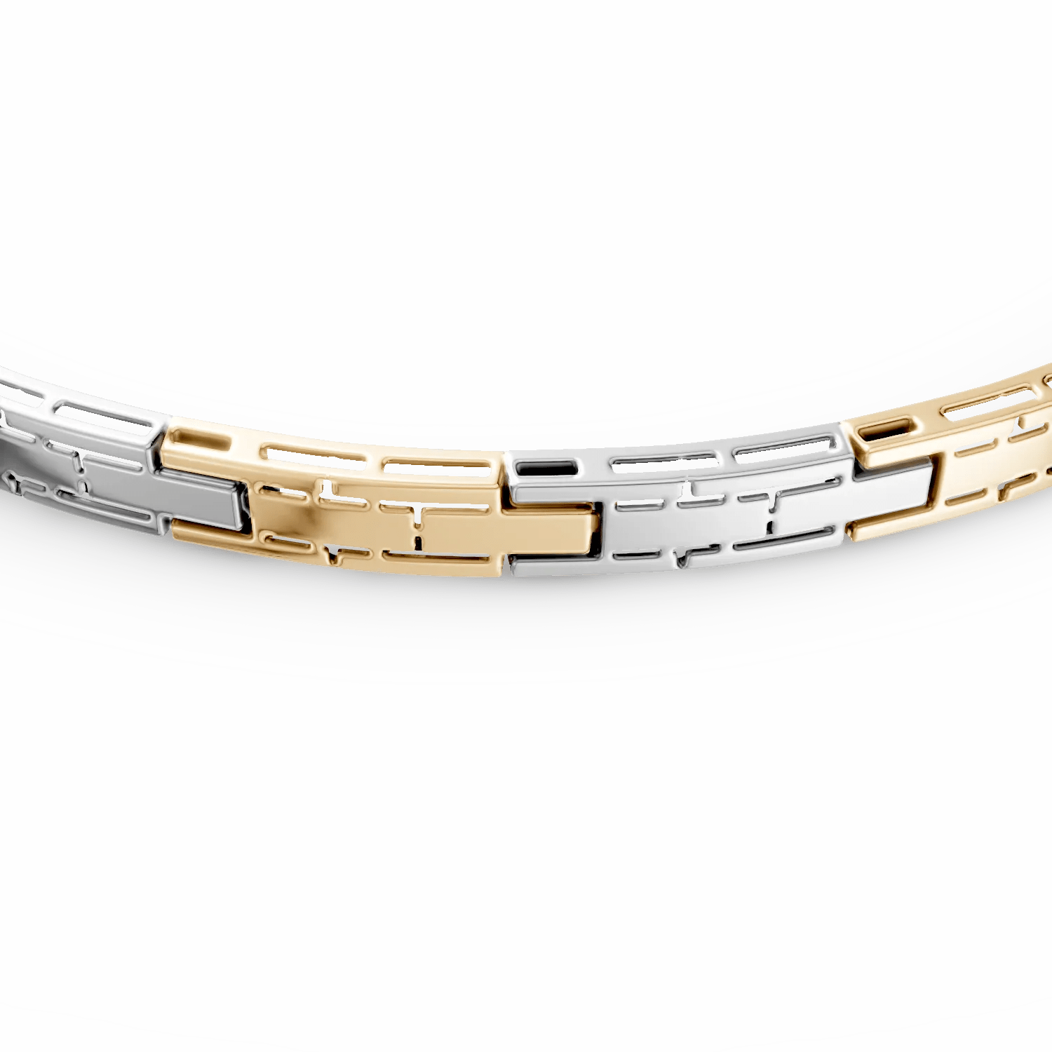 Brățara din aur alb-galben combină aspectul luxos al metalului prețios cu un design simetric elegant. Acest accesoriu sofisticat este perfect pentru a exprima rafinamentul prin stilul său distinctiv.