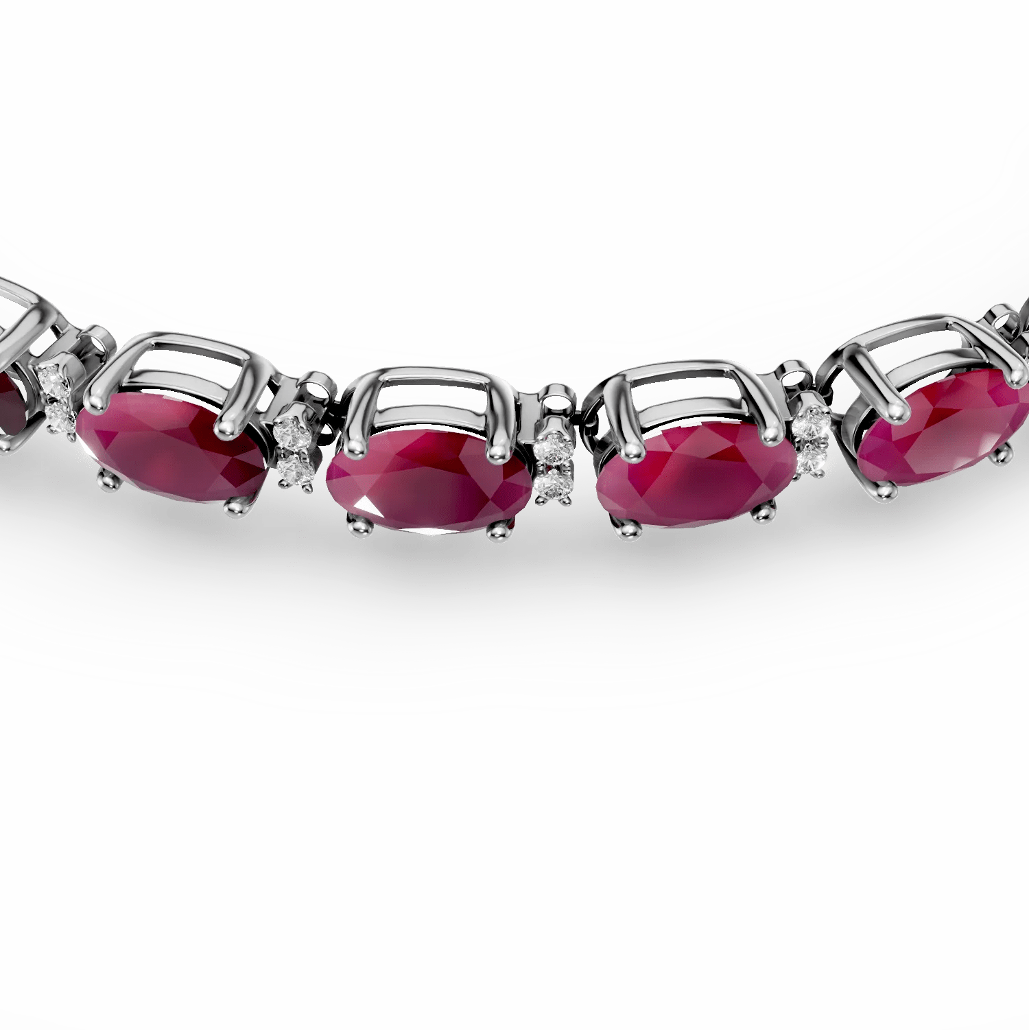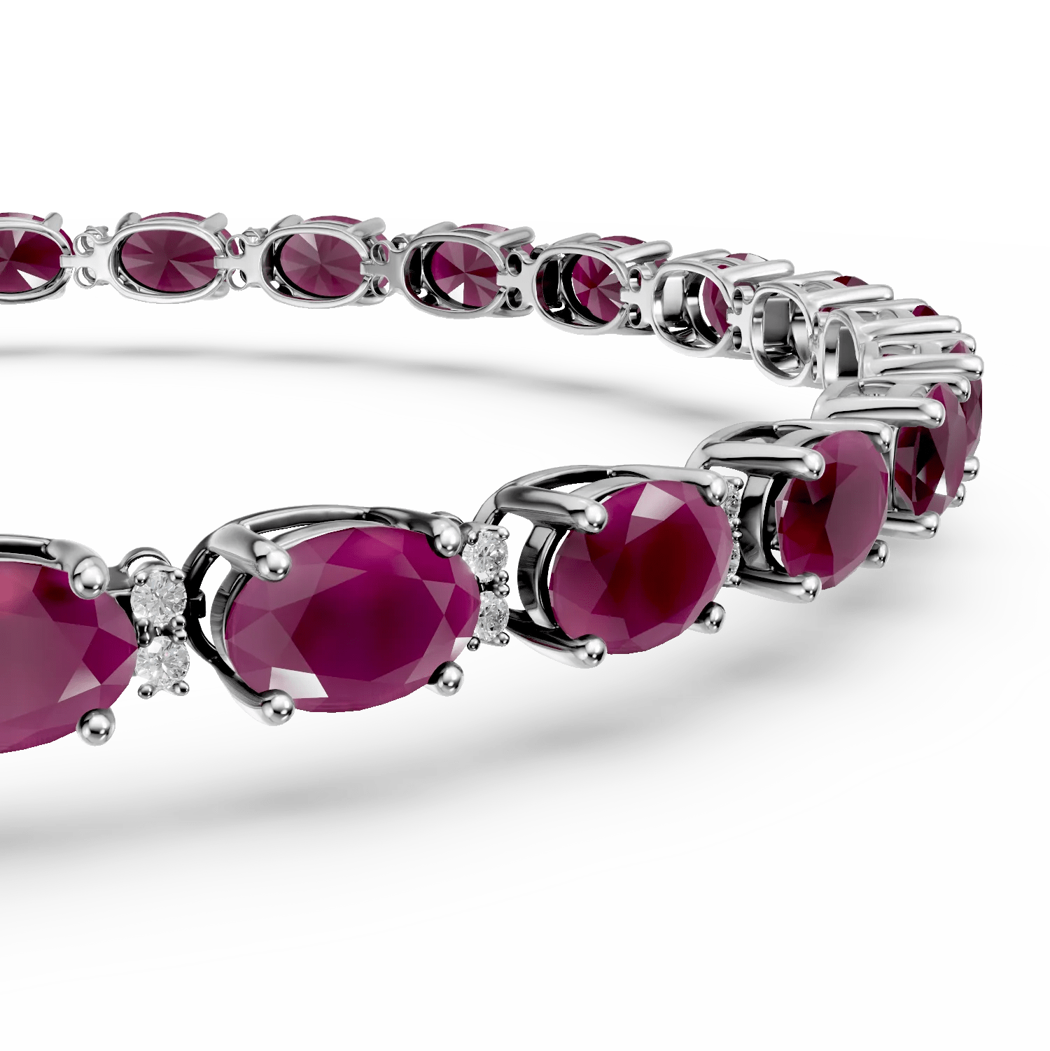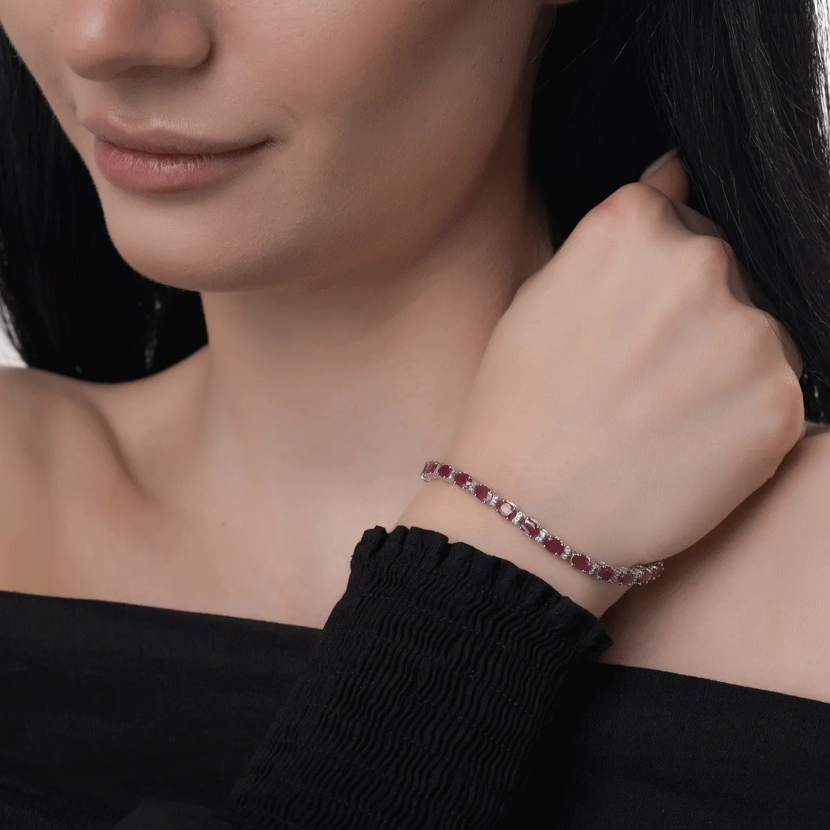 Această brățară din aur alb încântă prin eleganța sa, combinând rubine ovale de 8.53ct și diamante de 0.26ct. Designul său minimalist și contrastul dintre nuanțele puternice ale rubinelor și lumina rece a diamantelor creează o piesă rafinată. Este accesoriul perfect pentru a adăuga un plus de distincție în orice moment.