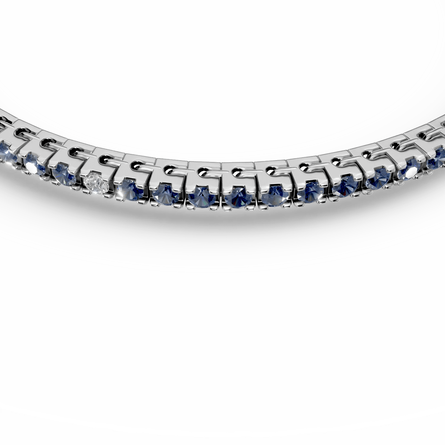 Pășește în eleganța bijuteriilor cu această brățară tennis din aur alb, decorată cu safire de 2.45ct și diamante de 0.15ct. Safirele ovale aduc o notă de profunzime, iar diamantele strălucesc cu un stil briliant, adăugând luminozitate.