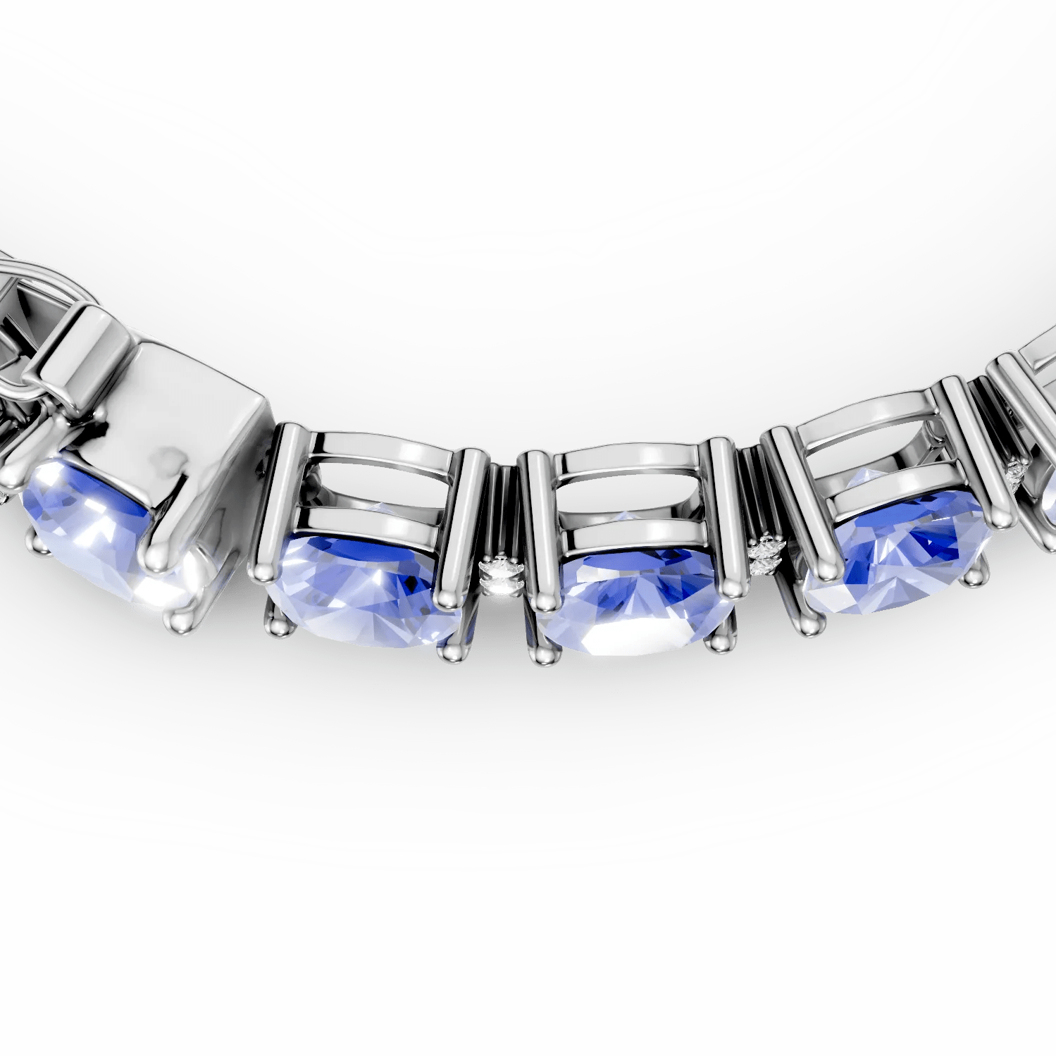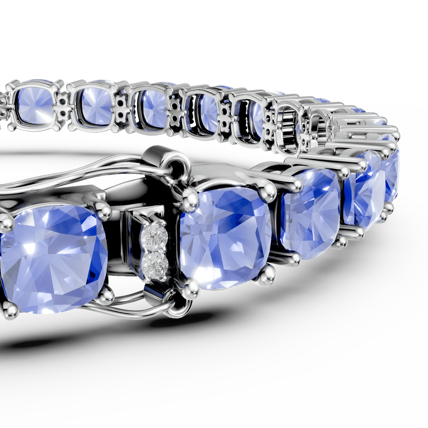 Această brățară tennis din aur alb surprinde prin tanzanitele cushion de 21.94ct și diamantele de 0.43ct, oferind un spectacol de culoare și strălucire. Tanzanitele îți amintesc de cerul de seară, iar diamantele evidențiază acest efect prin eleganța lor. Ideală pentru femeile care apreciază frumusețea autentică și rafinamentul subtil.