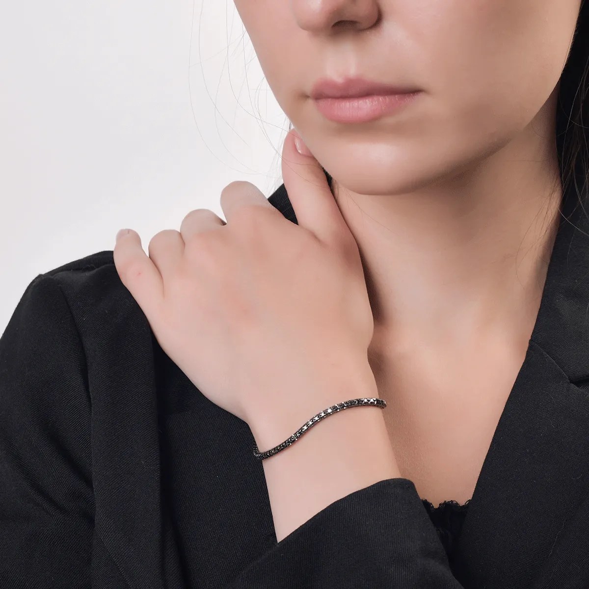 Cu un contur expresiv și nuanțe versatile, această brățară tennis din aur negru cu diamante negre de 4.1ct simbolizează rafinamentul modern. Liniile sale fluide și pietrele atent aliniate creează un accesoriu elegant și misterios, perfect pentru a sublinia stilul personal și eleganța contemporană, oferind profunzime oricărei ținute.
