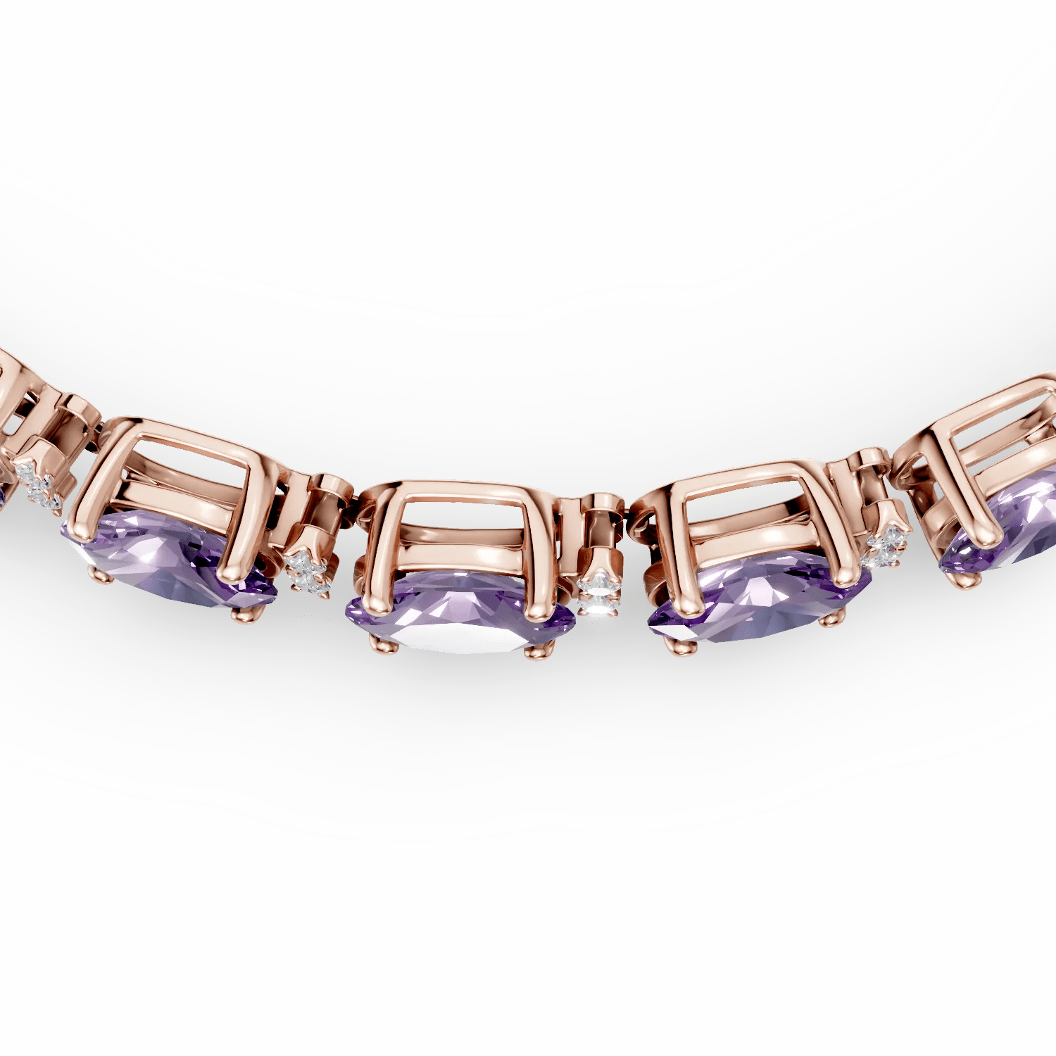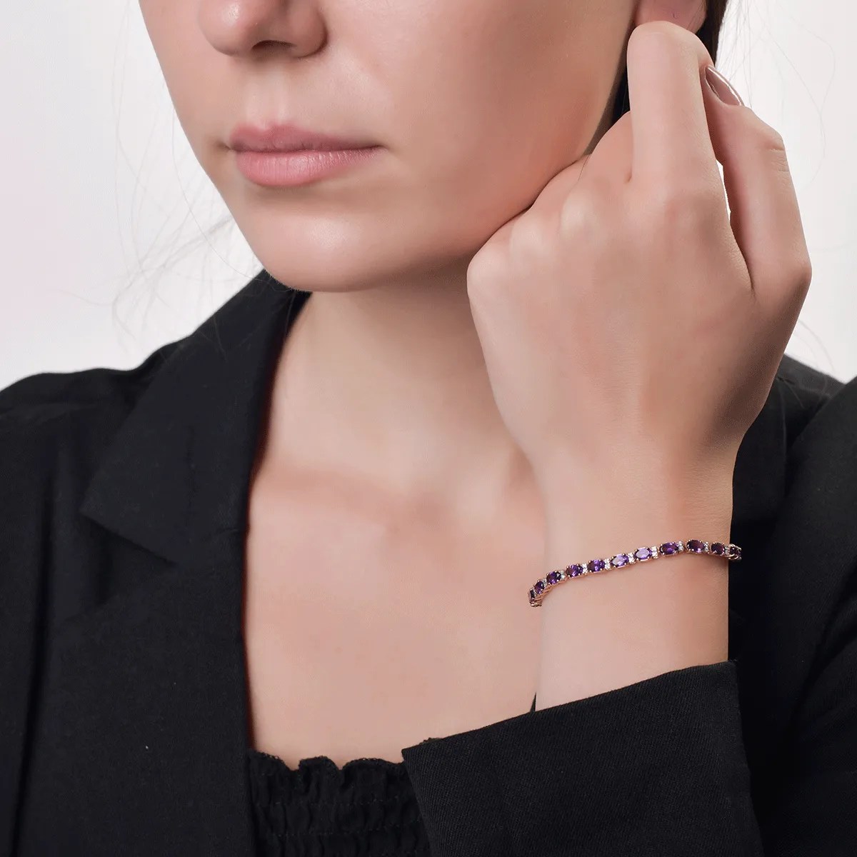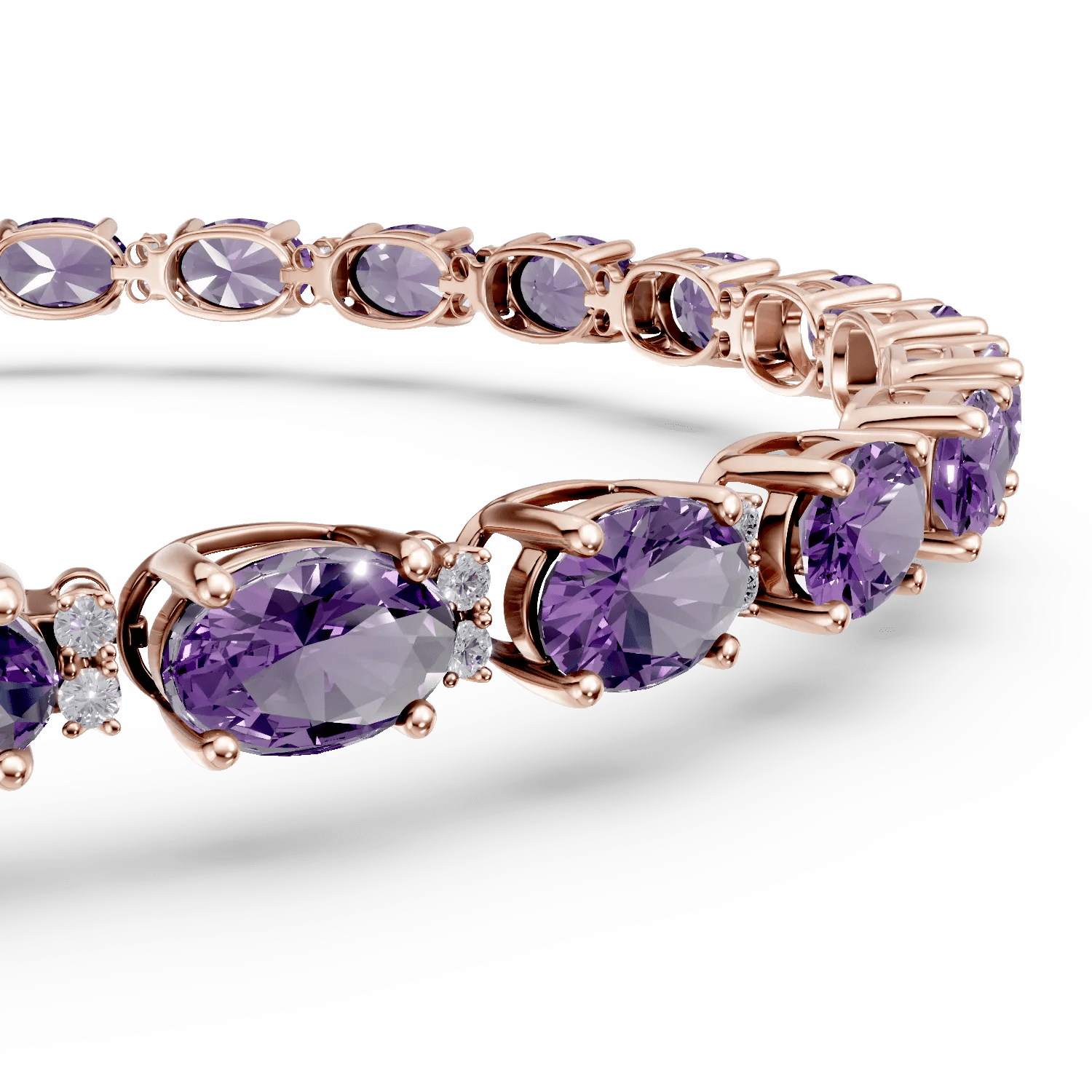 Această brățară tennis din aur roz, cu ametiste ovale de 5.03ct și diamante de 0.23ct, îți pune în evidență rafinamentul. Ametistele cu tăietură ovală crează un efect subtil și elegant. Fie că o porți singură sau cu alte accesorii, adaugă un stil romantic și modern.