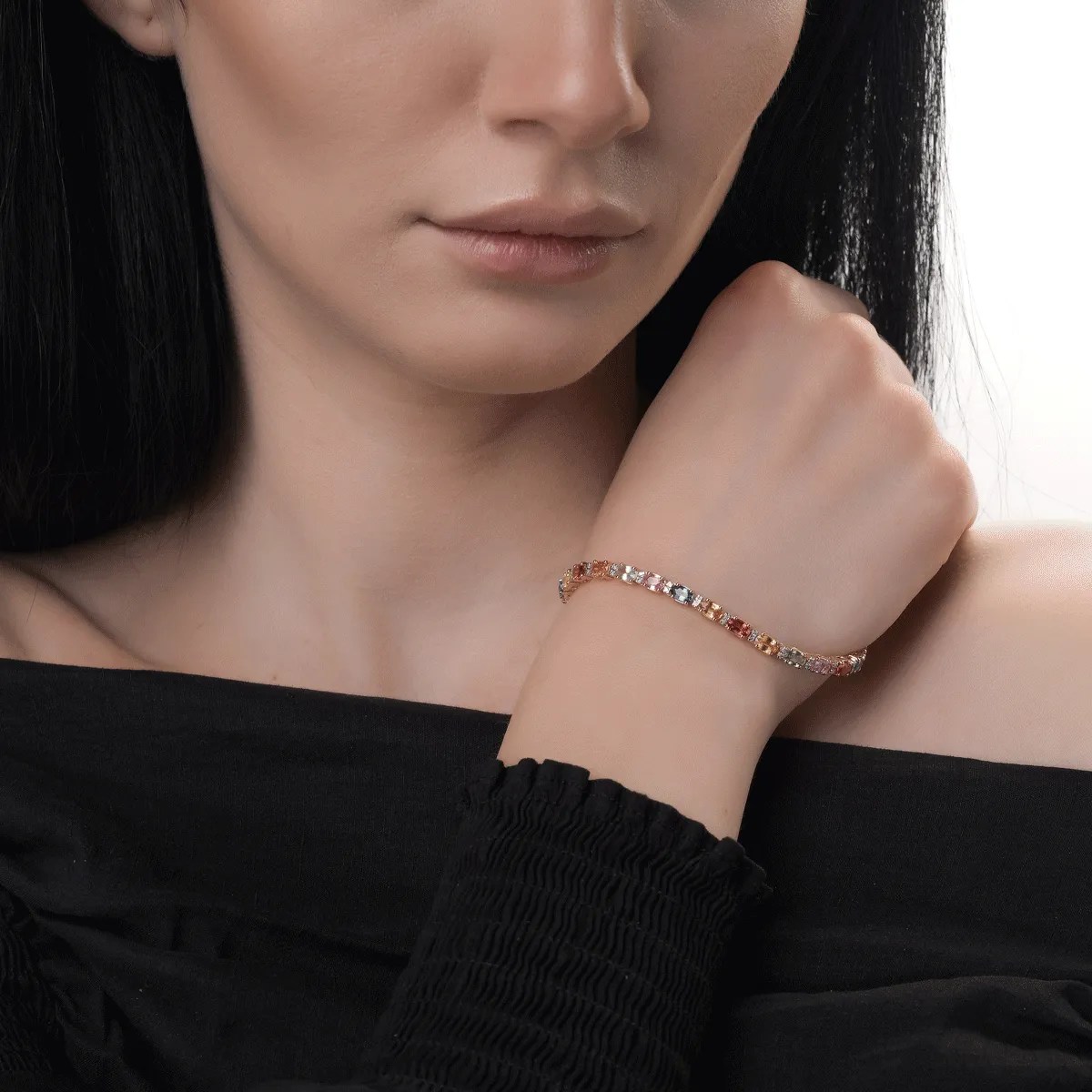 Această brățară din aur roz, împodobită cu safire multicolore de 8.17ct și diamante de 0.28ct, se remarcă prin designul său minimalist și modern. Tăietura ovala a safirelor pune în valoare intensitatea vibrantă a culorilor, creând o armonie atrăgătoare de nuanțe și reflexii. Un simbol al expresivității și libertății de a străluci.