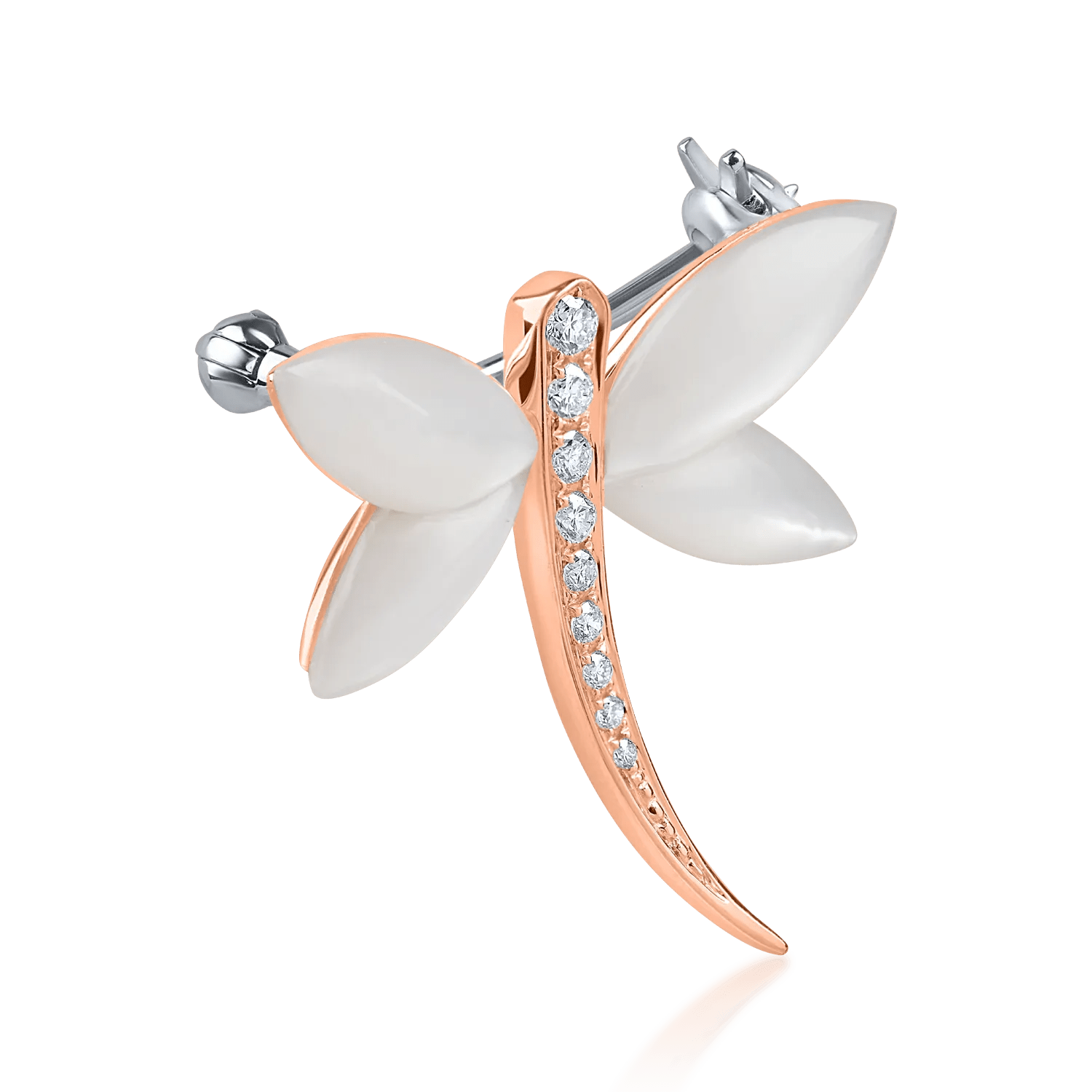 O combinație de eleganță și stil, această broșă fluture din aur alb-roz este accentuată cu sidef de 2.6ct și diamante de 0.11ct. Sideful catifelat și irizațiile sale subtile se completează perfect cu strălucirea clară a diamantelor, oferind bijuteriei un aspect sofisticat și modern.