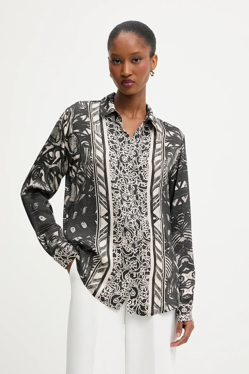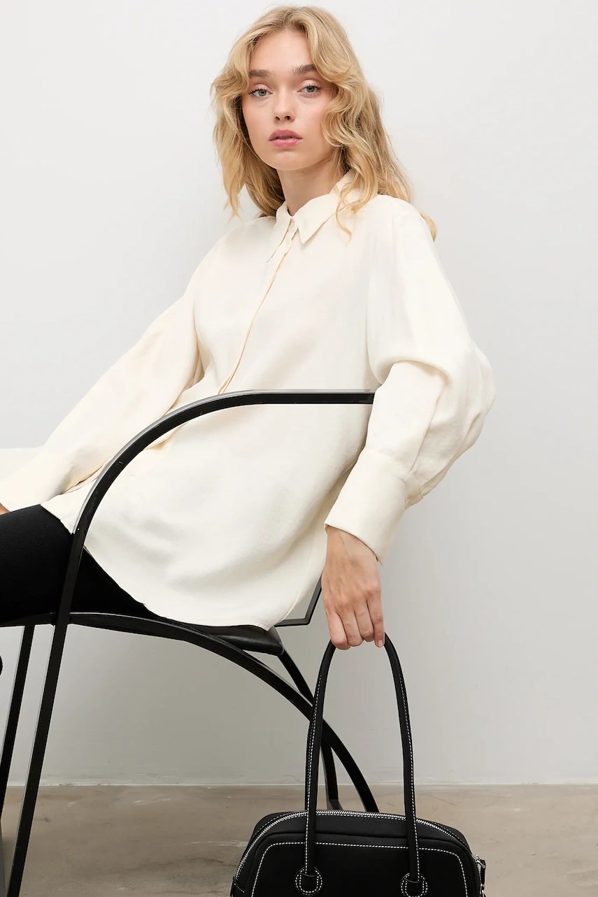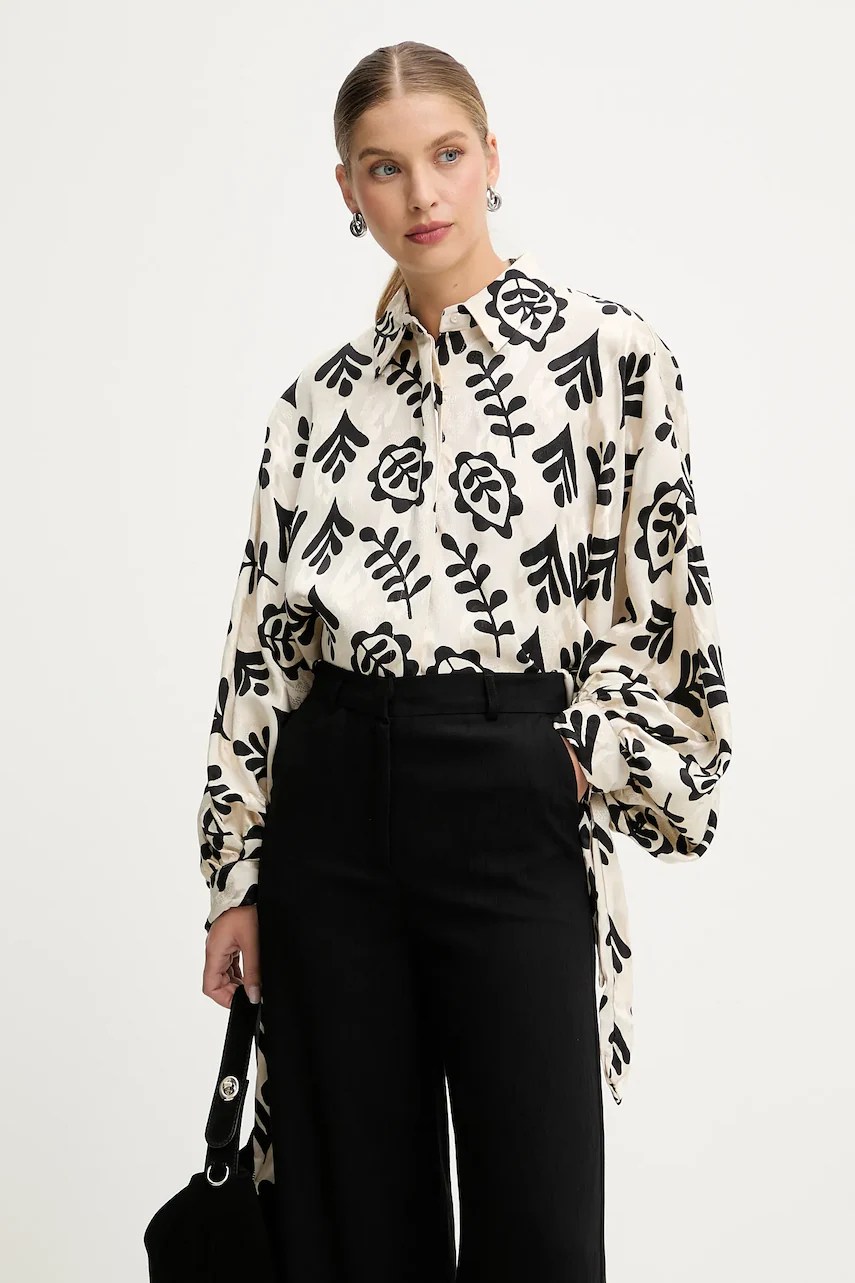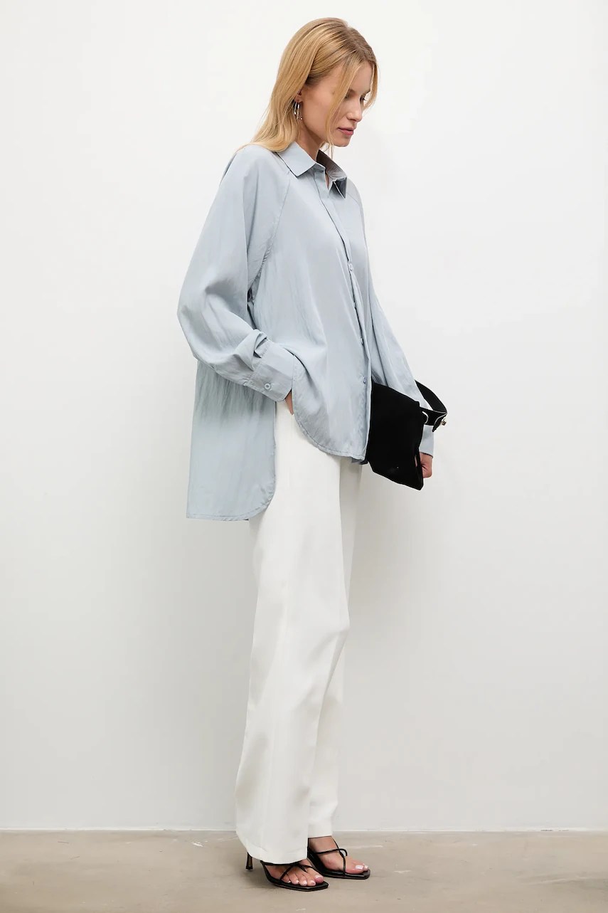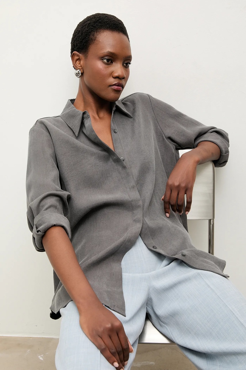 Cămașă realizată parțial din lyocell, un material derivat din celuloză din copaci cultivați în păduri certificate. Designul are o tăietură simplă fără blocare, iar închiderea cu nasturi permite o purtare ușoară.