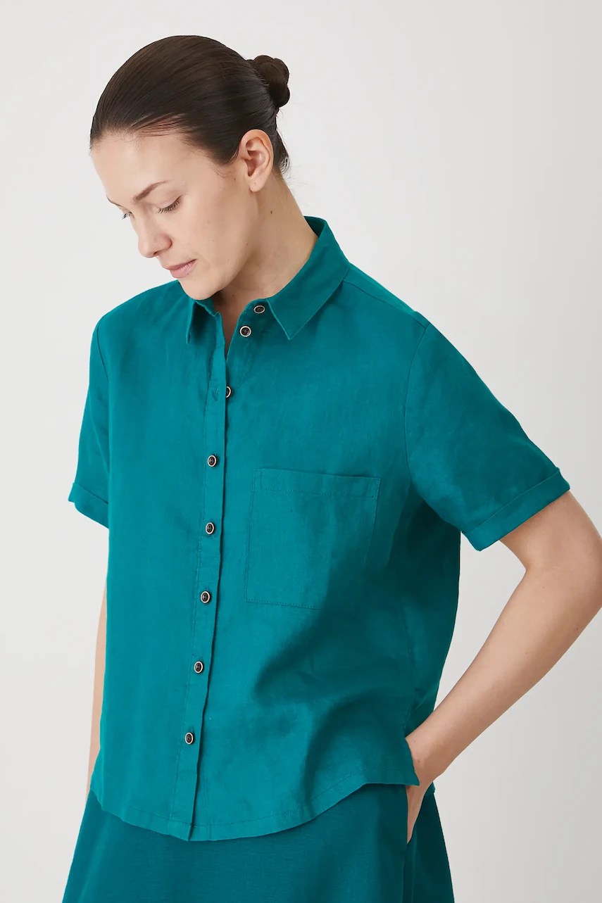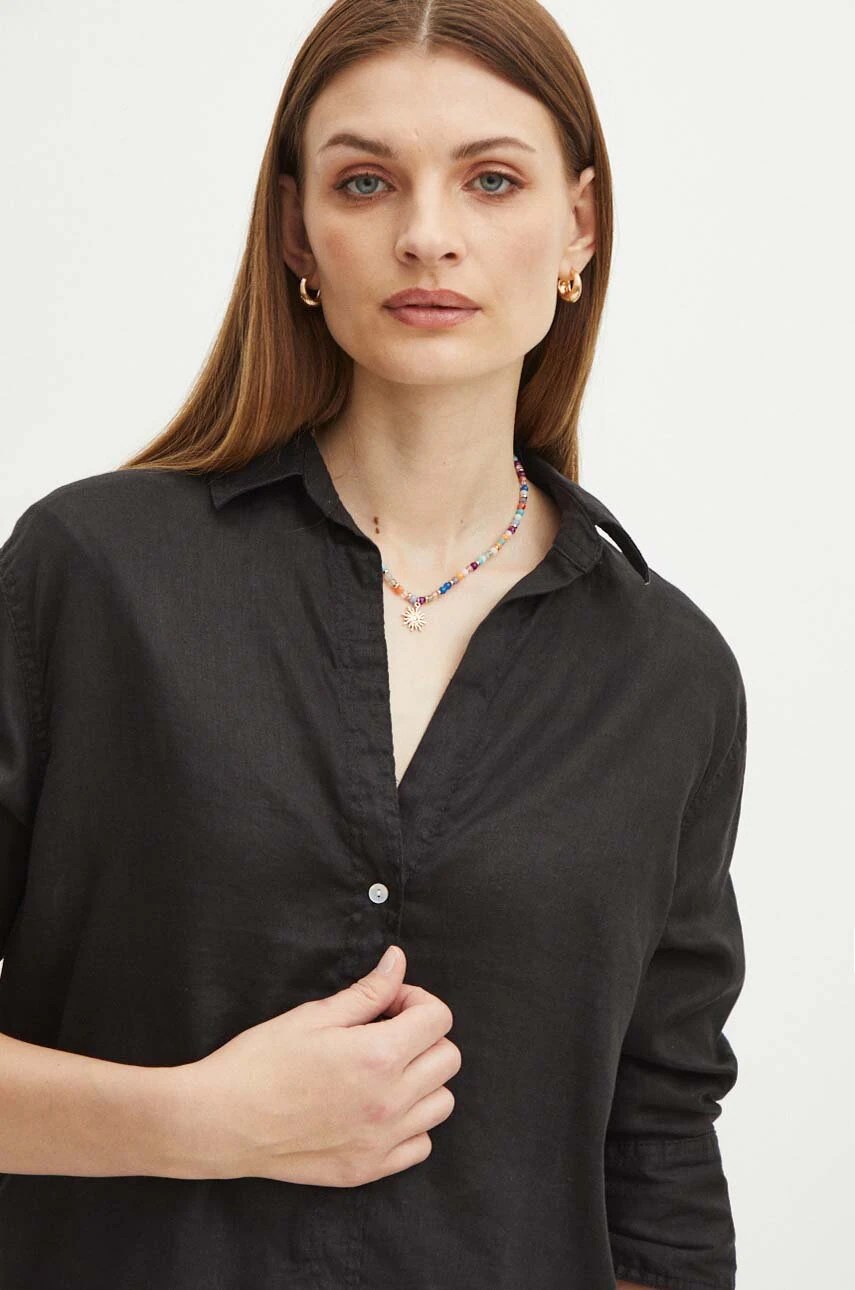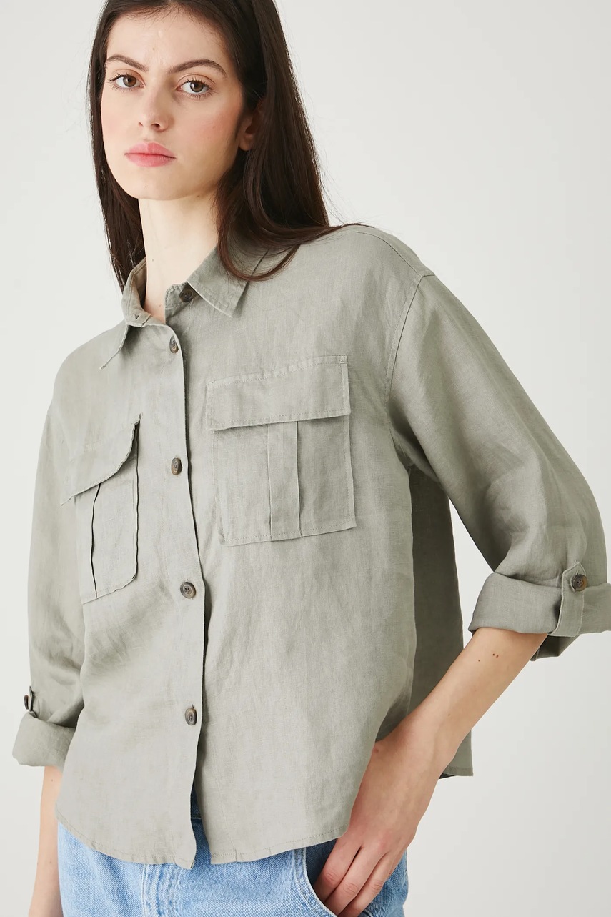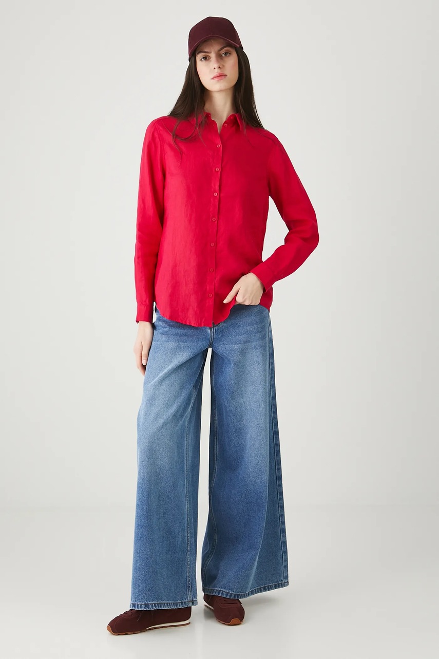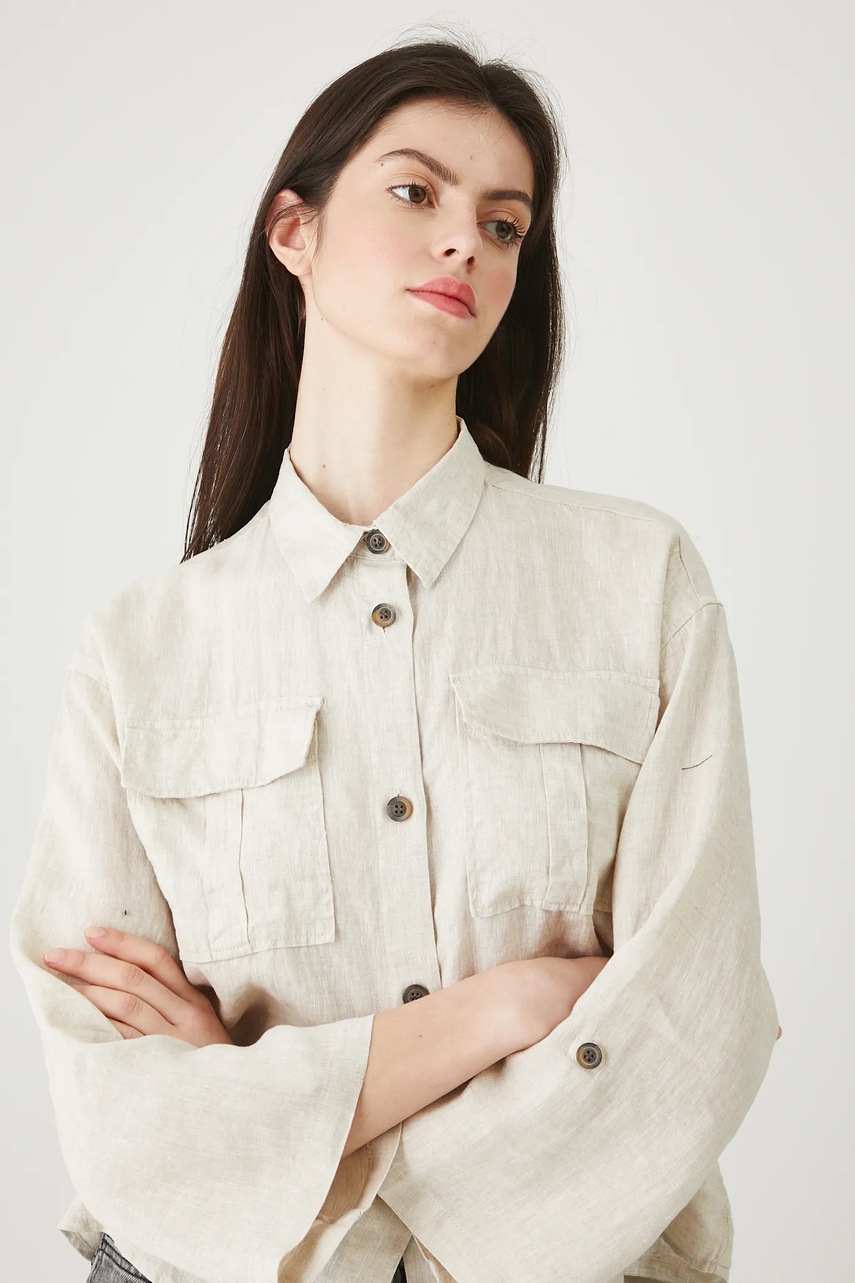 Cămașă confecționată din material natural 100% in, oferind un stil lejer și durabil.