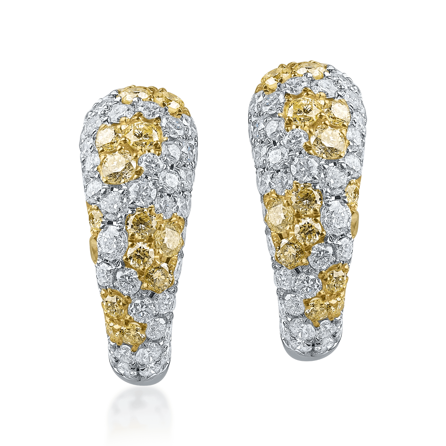 Aceste bijuterii din aur alb combină diamante galbene baguette cu altele rotunde incolore, contribuind la o strălucire distinctivă. Combinația de pietre galbene și incolore oferă un contrast armonios și elegant. Cerceii sunt finalizați cu tăieturi precise baguette și rotunde, aducând un plus de rafinament și originalitate designului.