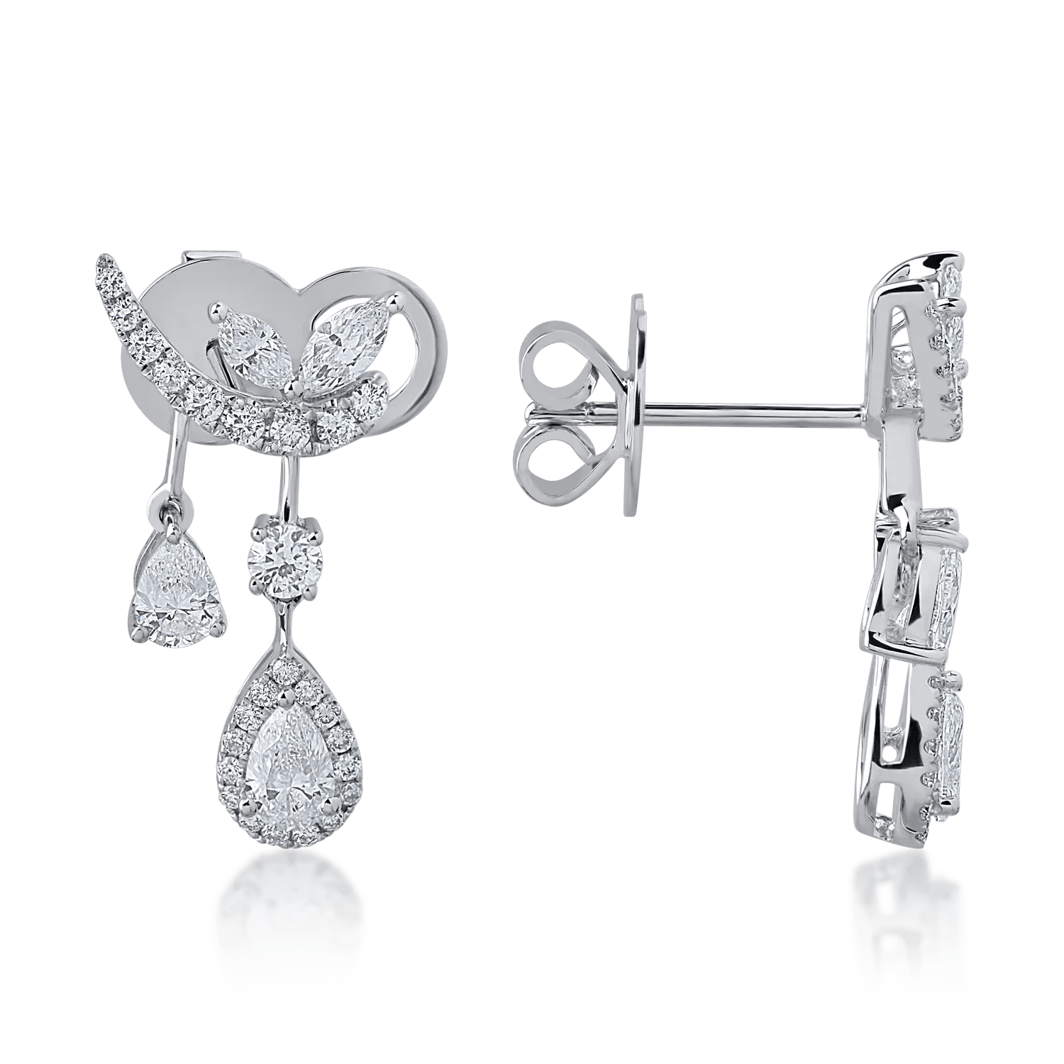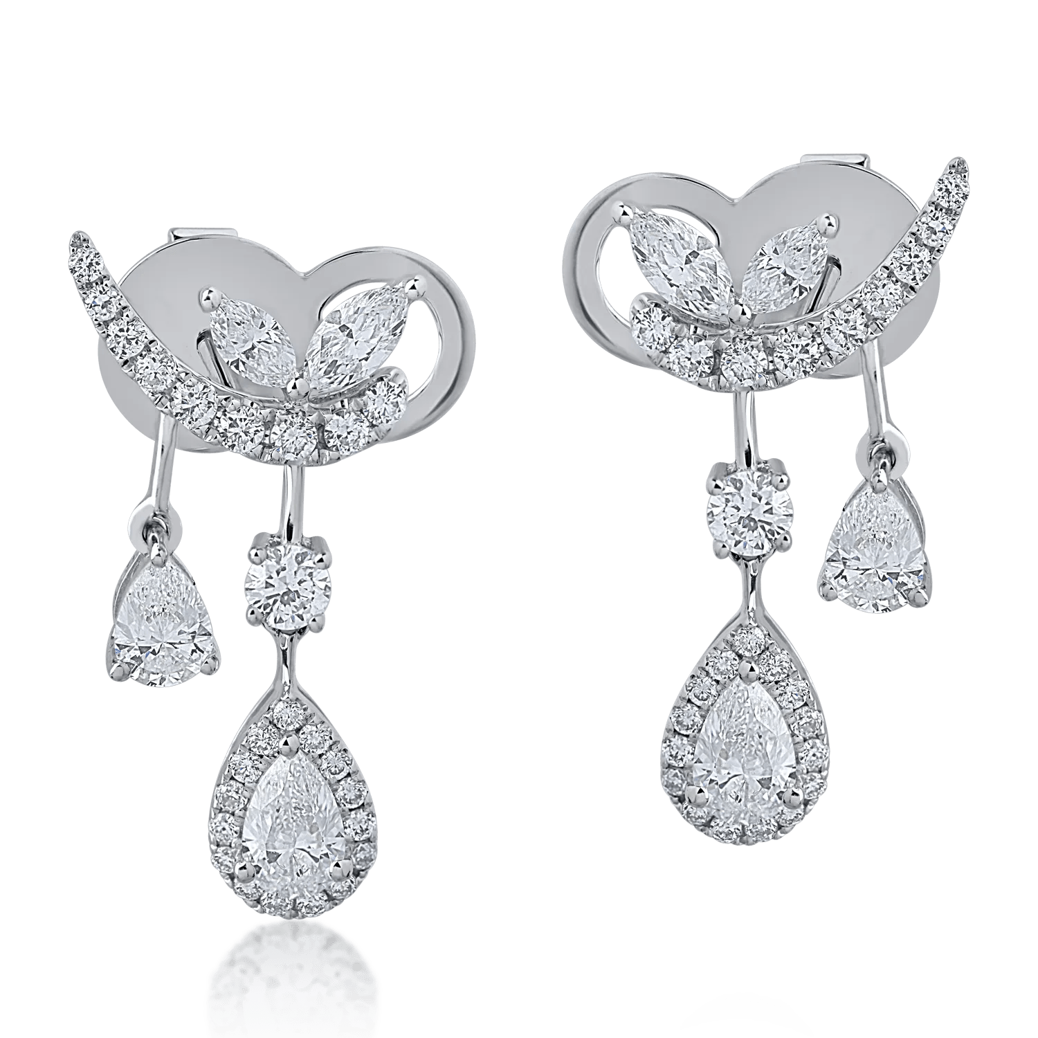 Cerceii din aur alb, împodobiți cu diamante marquise, pear și rotunde de 1.68ct, se remarcă prin designul care îmbină eleganța modernă cu o strălucire dinamică. Reflexiile captivante sunt create de jocul formelor, transformând fiecare mișcare într-un moment memorabil.