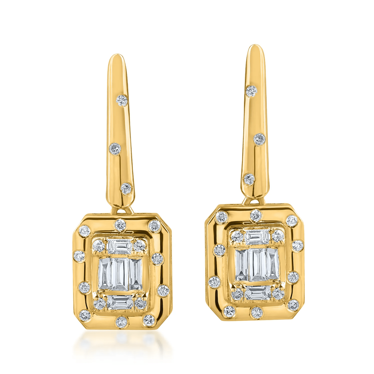Acești cercei din aur galben, cu diamante baguette și rotunde de 0.3ct, îmbină precizia modernă cu o strălucire aparte. Designul este completat de calitatea aurului galben, aducând un aer clasic și cald. Ideali pentru cei care apreciază estetica și detaliile rafinate.