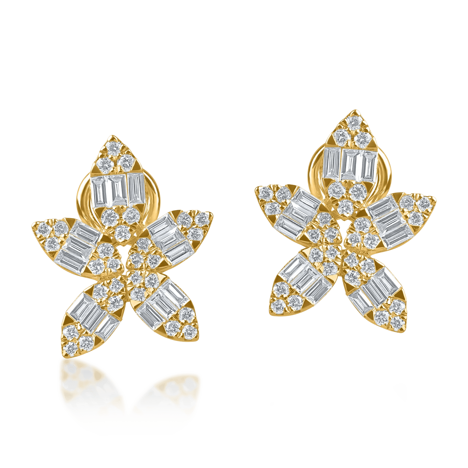 Acești cercei în formă de flori sunt realizați din aur galben și împodobiți cu diamante baguette și rotunde, totalizând 1.3 carate. Designul floral este pus în valoare de tăieturile baguette, în timp ce diamantele rotunde adaugă strălucire şi echilibru. Aurul galben oferă o eleganță caldă şi sofisticată.