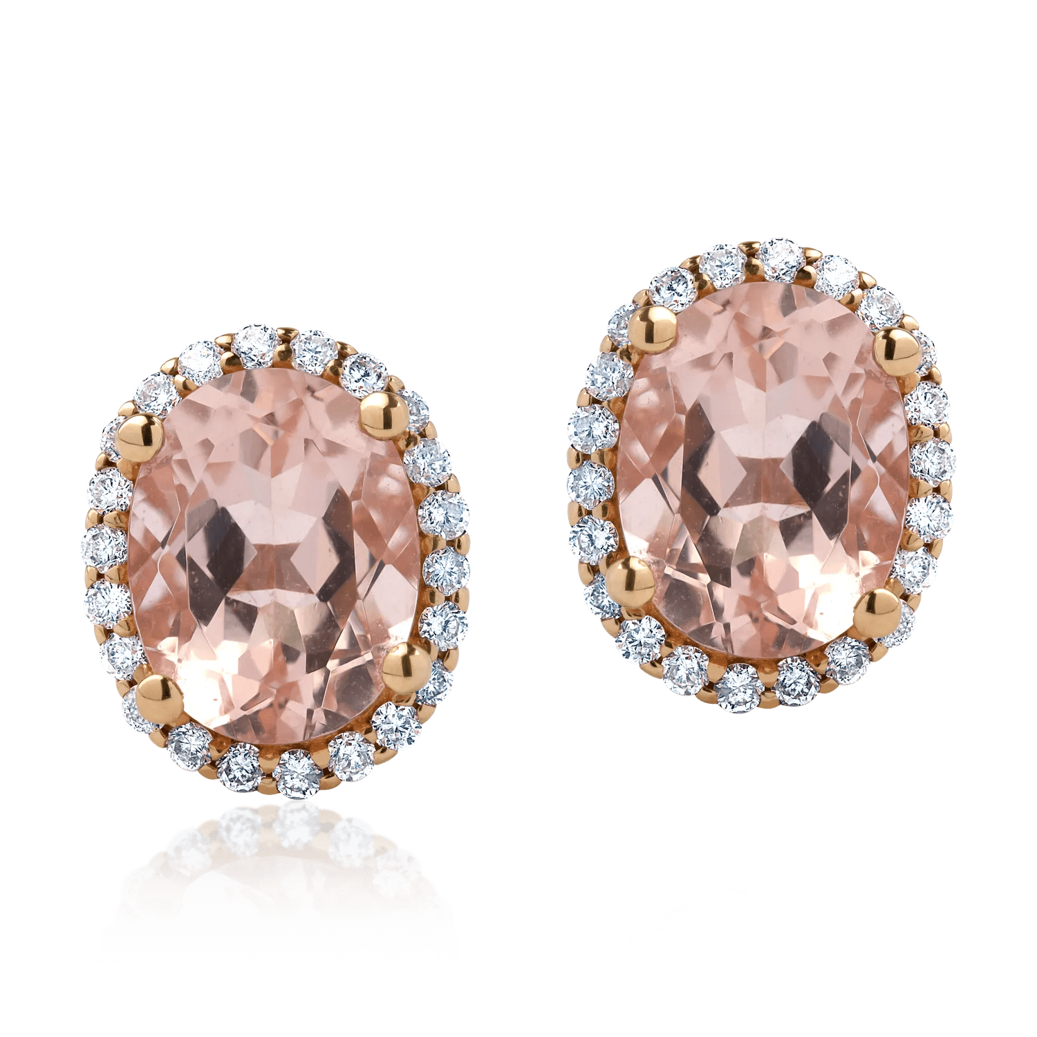 Aceste cercei din aur roz, cu morganite de 3.5ct și diamante de 0.34ct, combină strălucirea subtilă cu nuanțele calde. Taietura ovală a morganitelor pune în valoare transparența pietrelor, în timp ce diamantele adaugă o notă de luminozitate delicată.