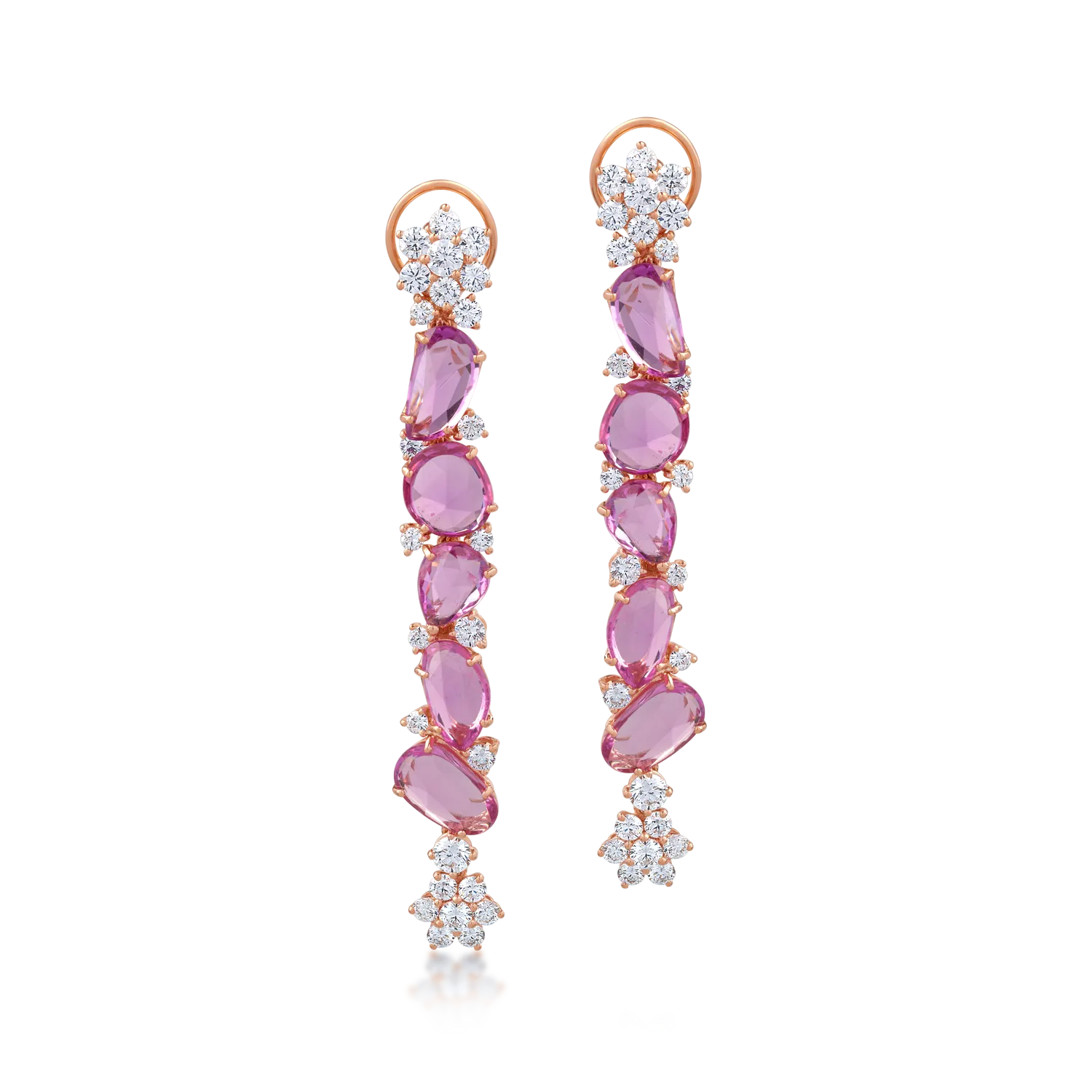 Acești cercei din aur roz, cu safire roz de 13.73ct și diamante rotunde de 2.91ct, oferă un contrast remarcabil între culoare și lumina diamantelor. Forma ovală a safirelor și tăietura rotundă a diamantelor subliniază eleganța, în timp ce aurul roz aduce un plus de căldură. Designul oferă rafinament autentic, fiind o creație semnată TEILOR.