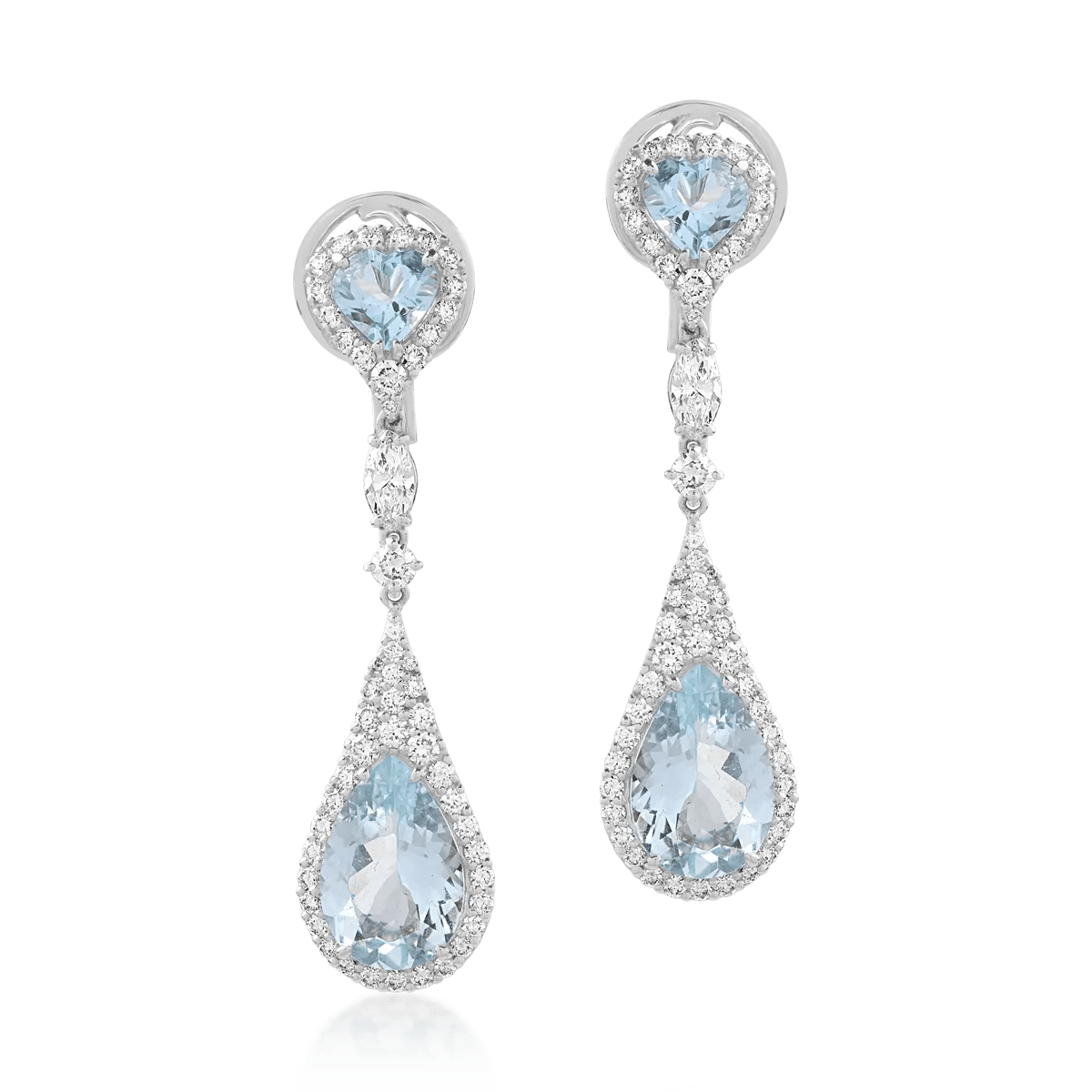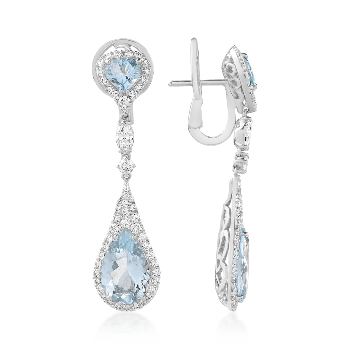 Acești cercei din aur alb prezintă un design sofisticat, combinând acvamarine de 5.92ct și diamante de 1.72ct. Pietrele sunt dispuse în tăieturi round, pear și marquise, oferind un rafinament inconfundabil. Bijuteria se remarcă prin strălucirea pietrelor și eleganța aurului alb, fiind o alegere ideală pentru momente speciale. Descoperă piesele unice la TEILOR.