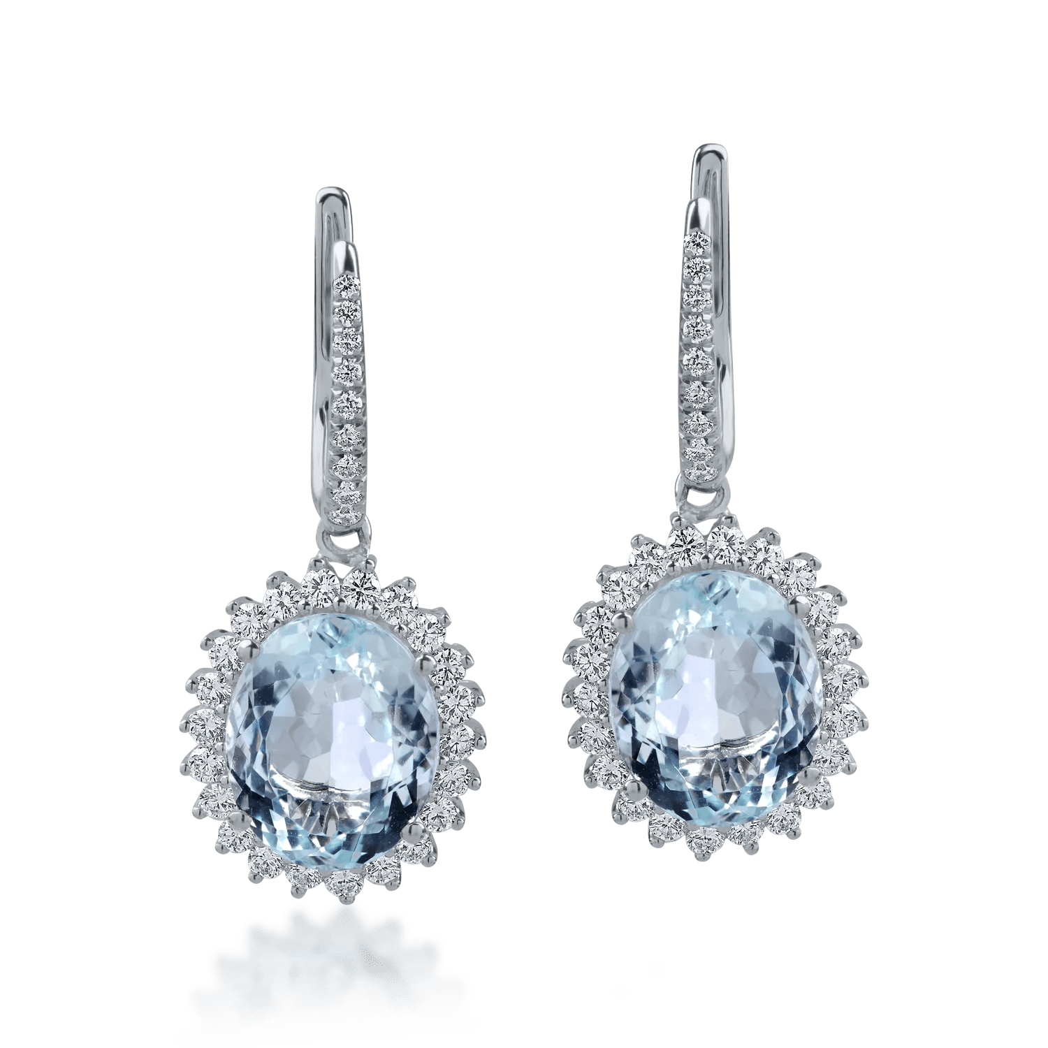 Transformă-ți apariția cu acești cercei din aur alb, ce combină acvamarine ovale de 7.62ct și diamante de 0.94ct. Designul modern evidențiază armonia culorilor și strălucirea detaliilor.