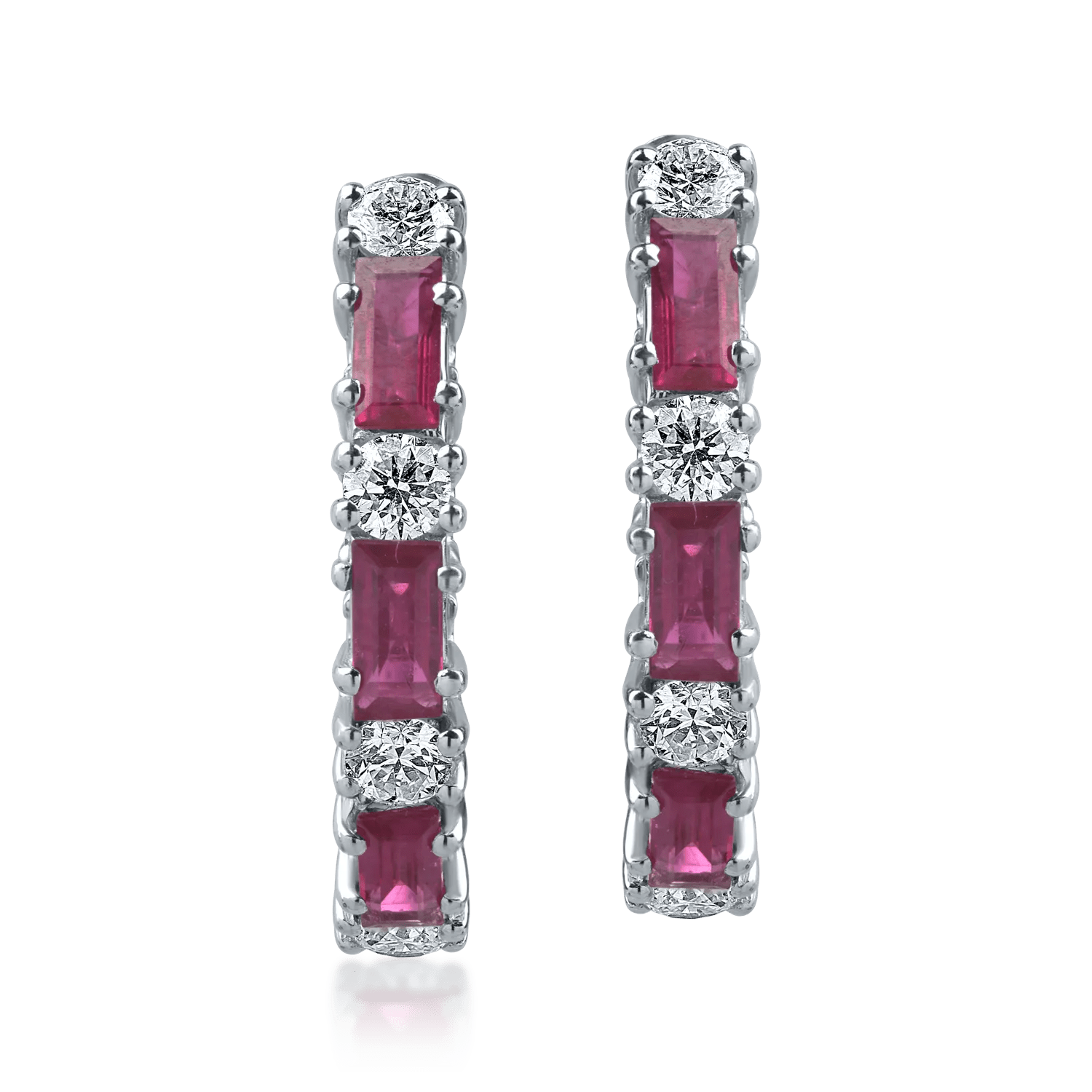 Acesti cercei din aur alb îmbină rubine baguette de 0.8ct cu diamante rotunde de 0.2ct, creând un design sofisticat. Intenția culorilor și strălucirea se potrivesc perfect stilului rafinat, potrivit pentru ținute elegante și ocazii speciale.