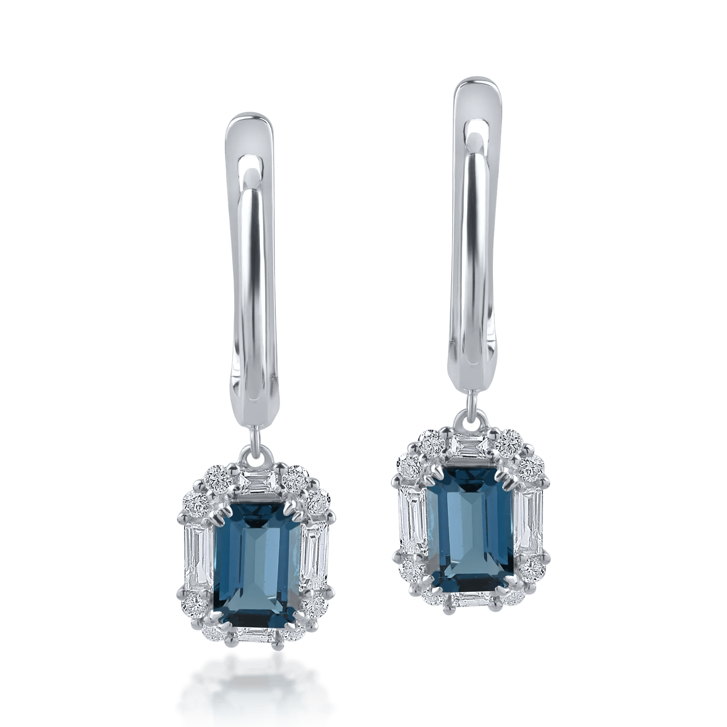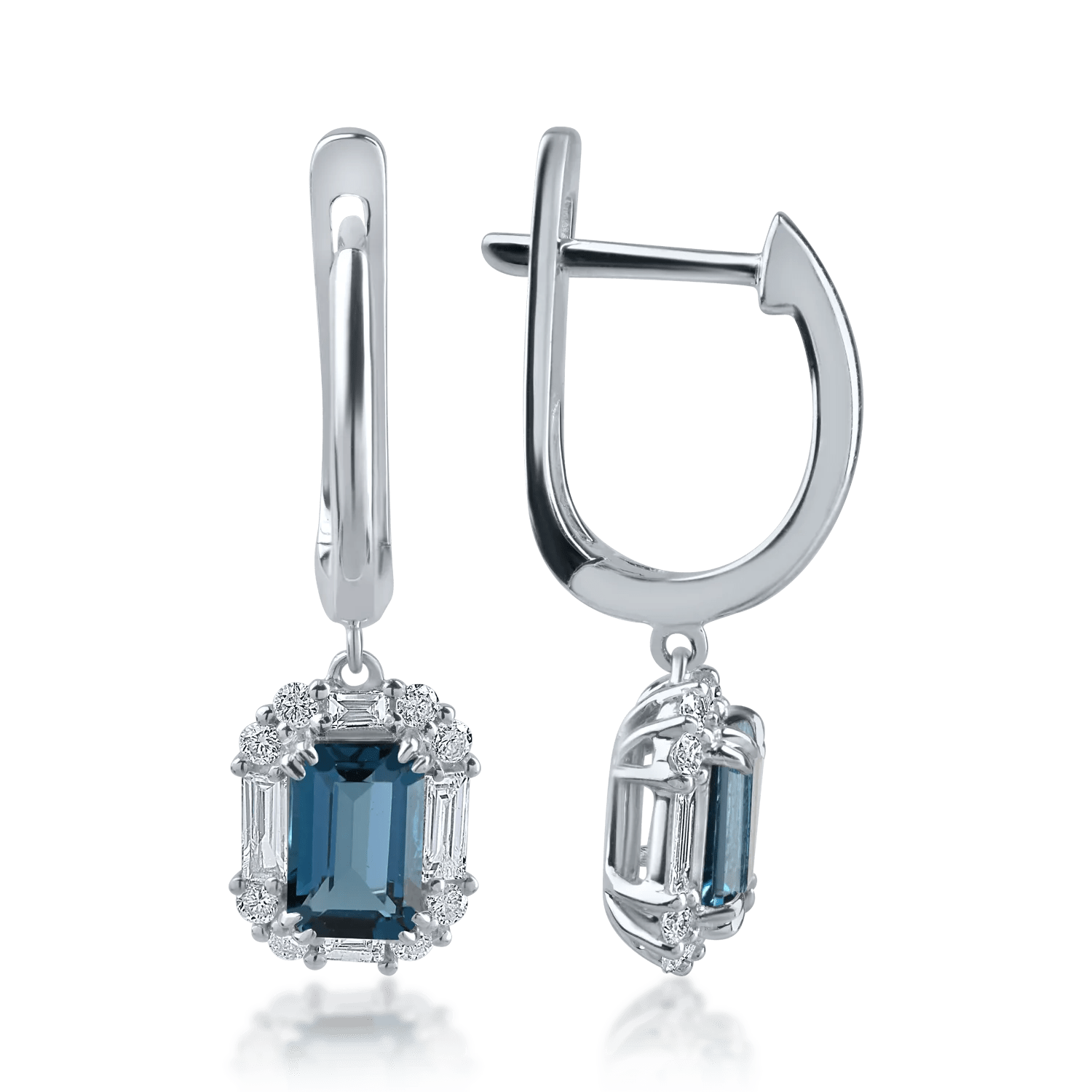 Cerceii din aur alb sunt accentuați de topaze London Blue de 1.23ct și diamante baguette și rotunde de 0.39ct. Bijuteria aduce în prim plan intensitatea nuanțelor și claritatea monturii.