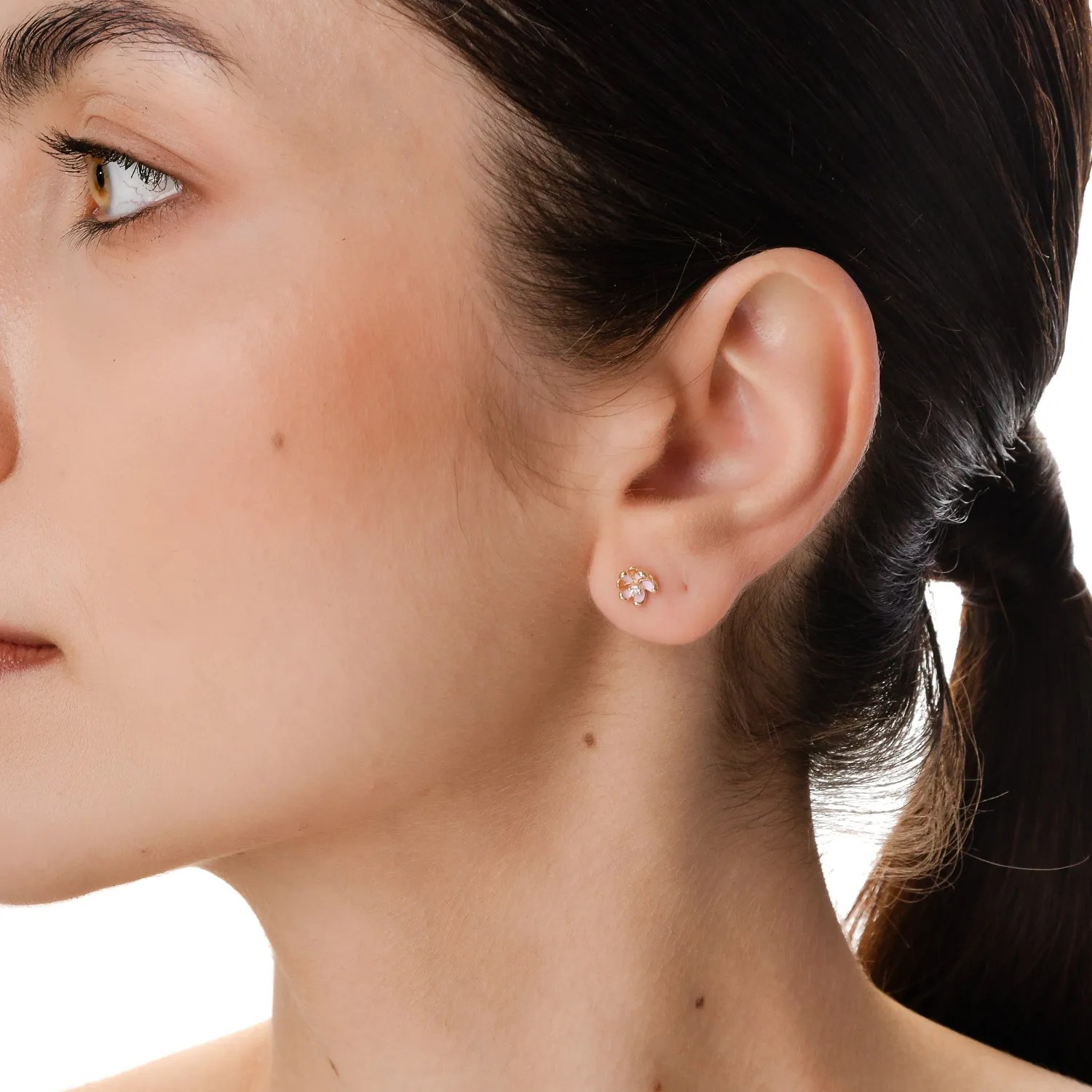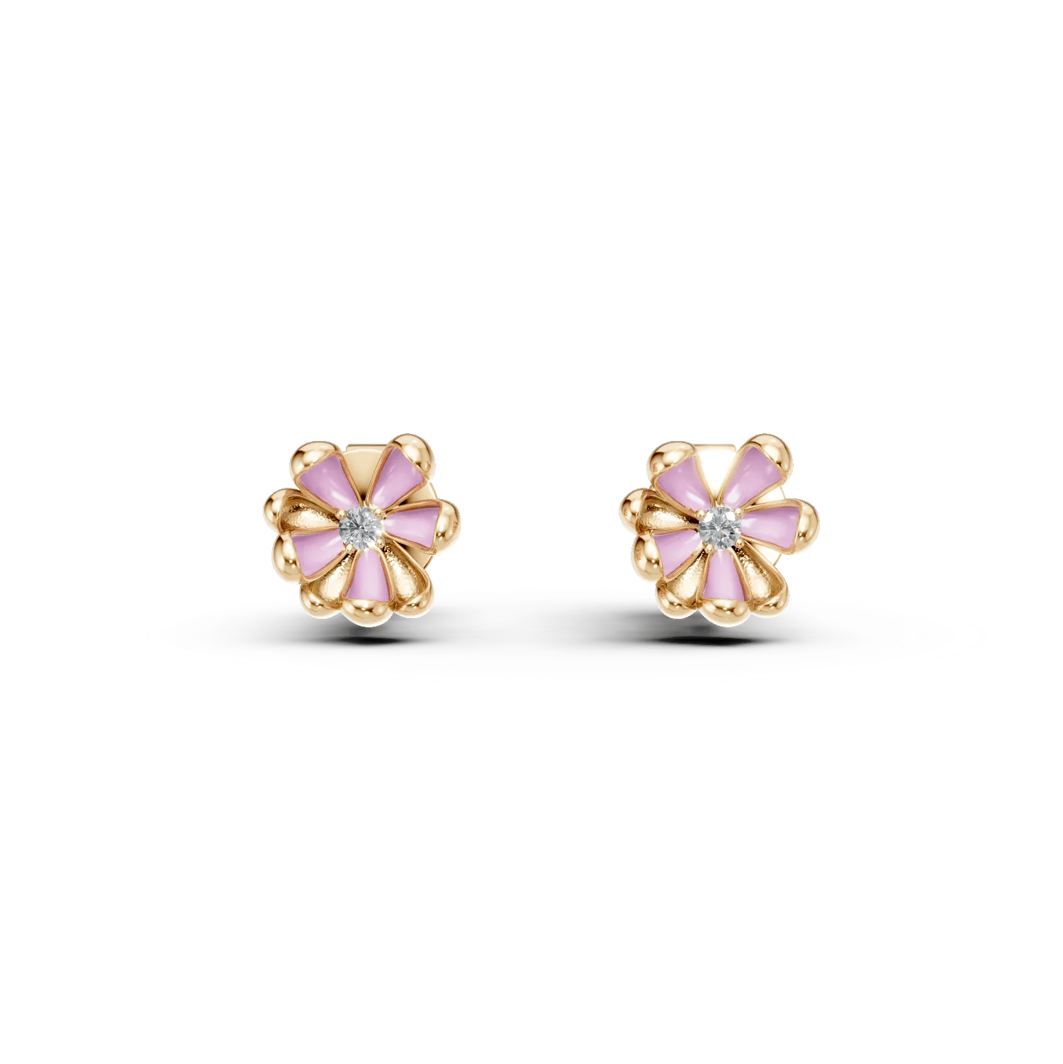 Cerceii din aur galben pentru copii, cu design în formă de flori de tei, sunt împodobiți cu diamante de 0.03ct. Această piesă combină strălucirea delicată a diamantelor cu un design fermecător și jucăuș, oferind un strop de magie copilăriei.