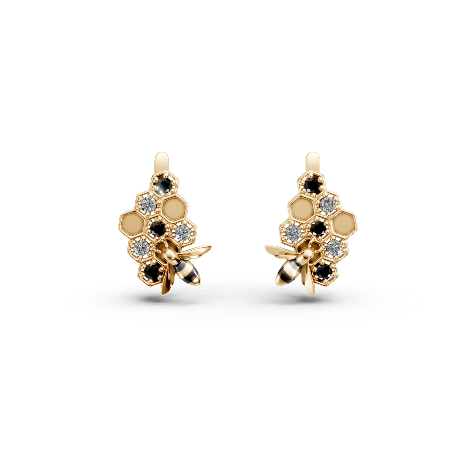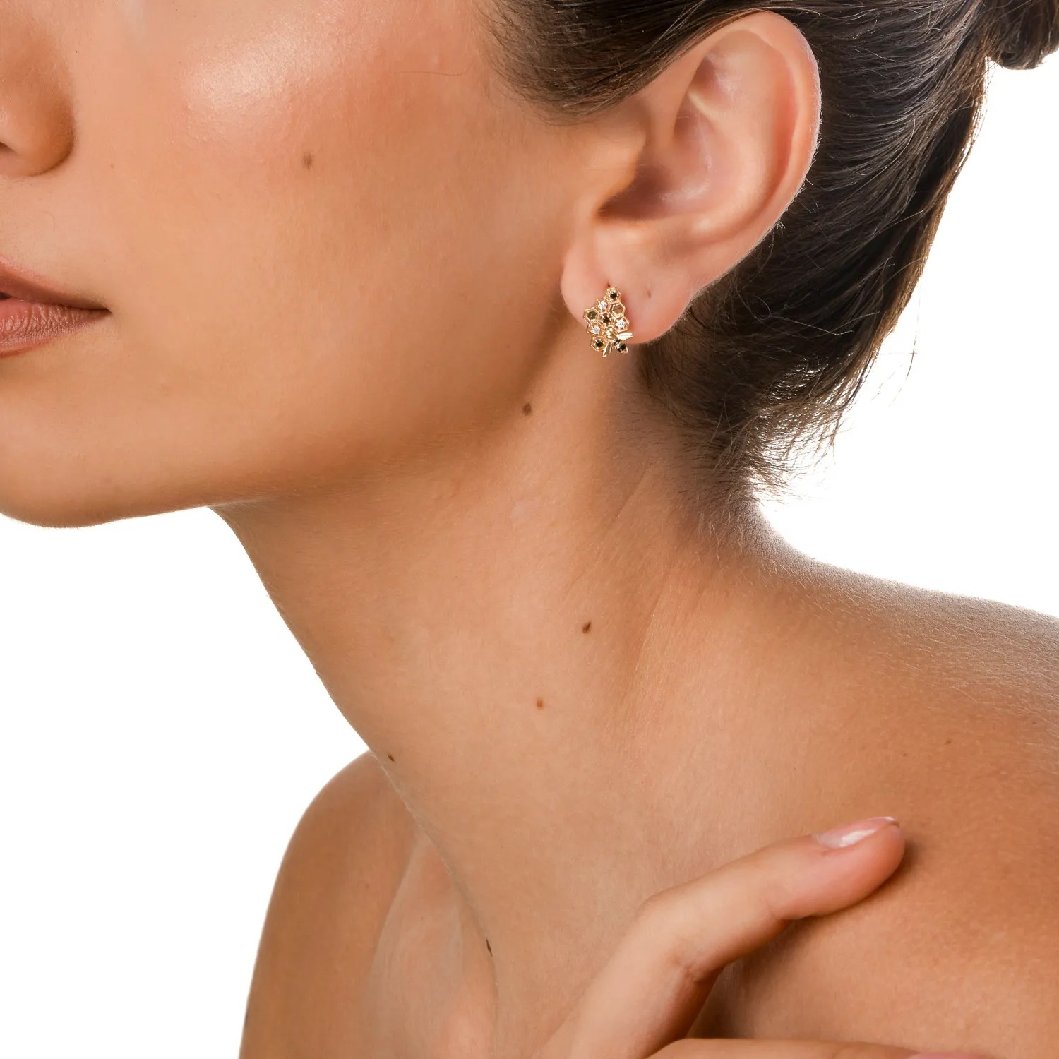 Cerceii din aur galben surprind armonia naturii printr-un design inspirat din elemente naturale. Structura hexagonală este subtil accentuată de diamante negre cu tăietură rotundă, de 0.09ct, și diamante incolore de 0.07ct, aducând o strălucire discretă și profunzime piesei.