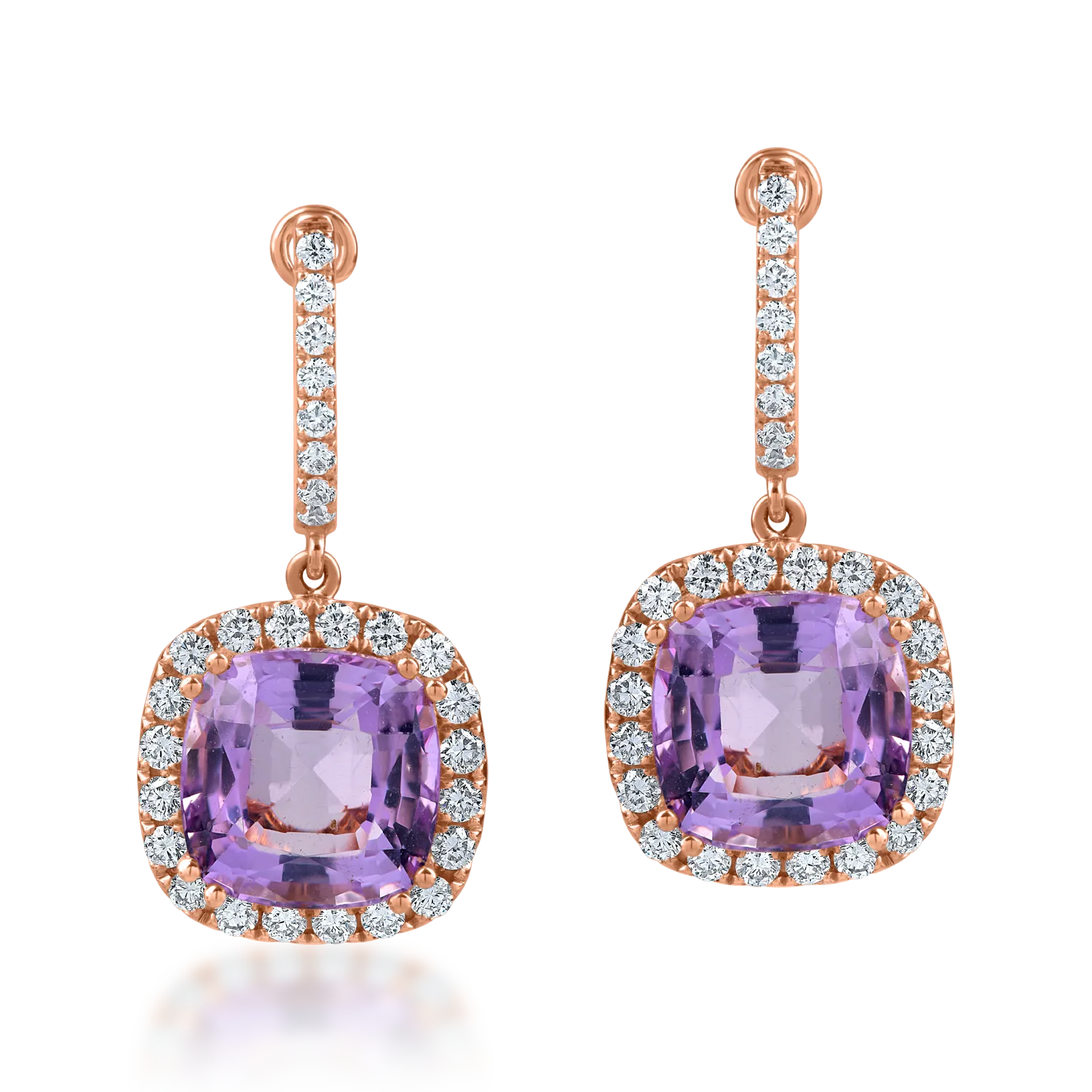 Cerceii combina eleganța aurului roz cu tonurile vibrante ale ametistelor rectangulare de 6.8ct. Reflexiile clare ale pietrelor sunt completate de diamantele de 0.7ct, adăugând o notă de profunzime. Designul său sofisticat evidențiază feminitatea și rafinamentul.