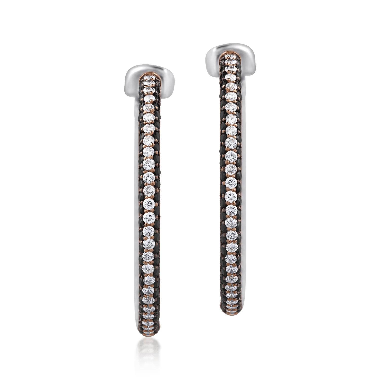 Experimentați emoțiile prin această pereche de cercei din aur roz, înfrumusețați cu diamante transparente de 0.78ct și diamante negre de 1.3ct.