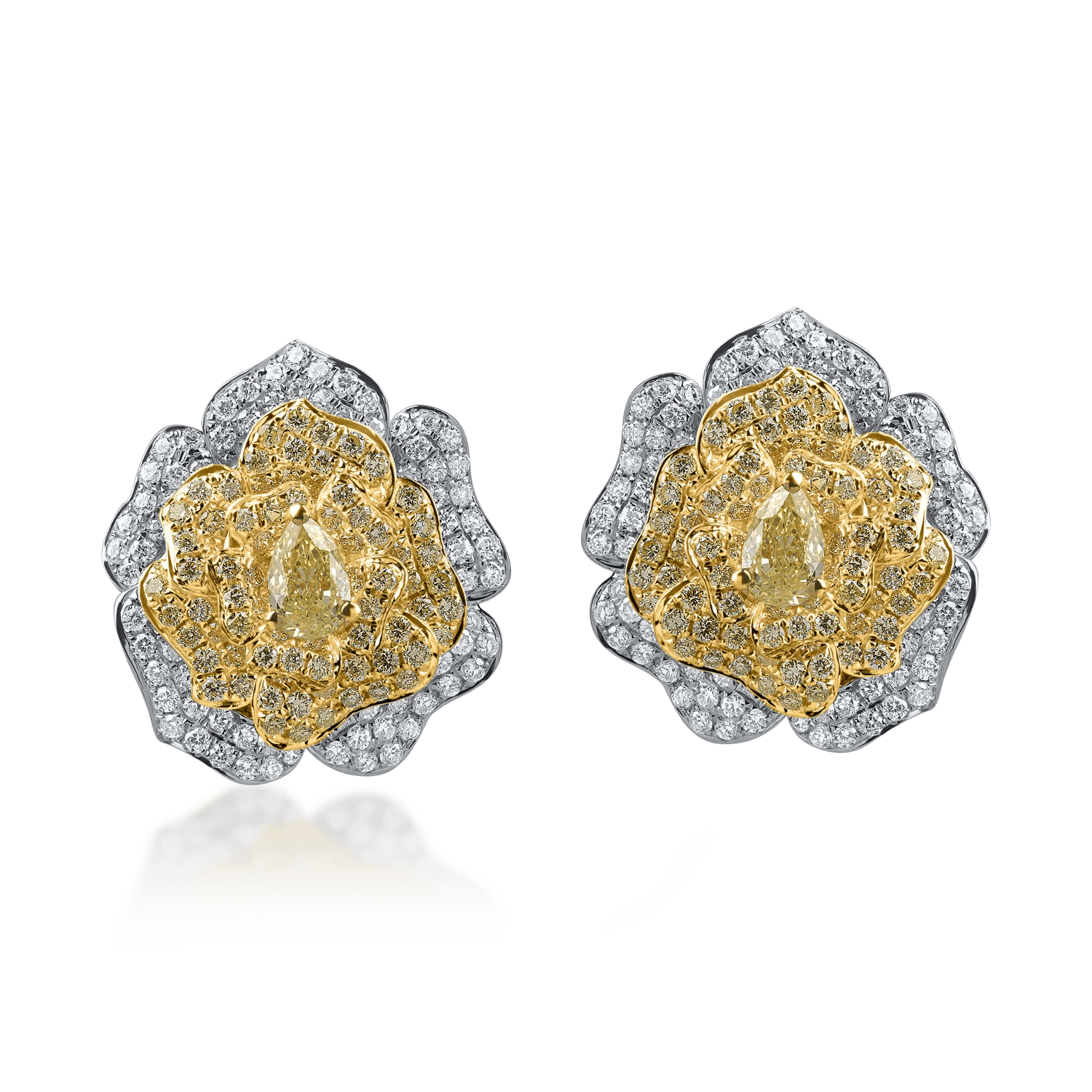 Cerceii floare sunt reinterpretați cu eleganță folosind aur alb-galben și diamante galbene și incolore de 2.6ct. Taieturile pear aduc fluiditate și strălucire, în timp ce diamantele rotunde echilibrează designul. Contrastul dintre nuanțele de aur subliniază rafinamentul acestora. Descoperă eleganța la TEILOR.