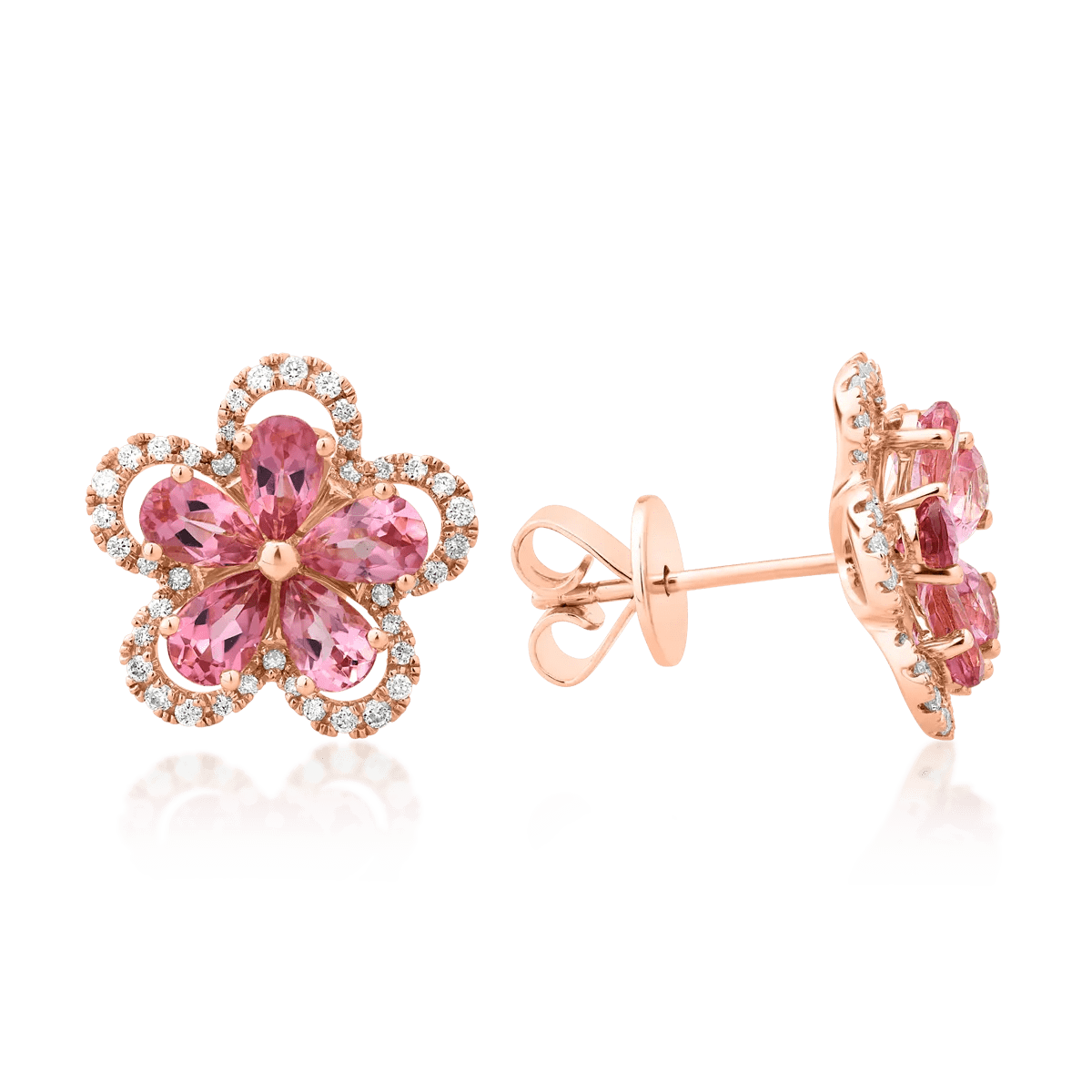 Cerceii floare din aur roz, înfrumusețați cu turmaline roz de 1.9ct, impresionează prin culoarea lor intensă și strălucirea sporită datorată tăieturii speciale. Diamantele de 0.29ct adaugă un plus de eleganță, completând designul rafinat. Aceasta pereche este ideală pentru a adăuga o notă sofisticată ținutelor tale.
