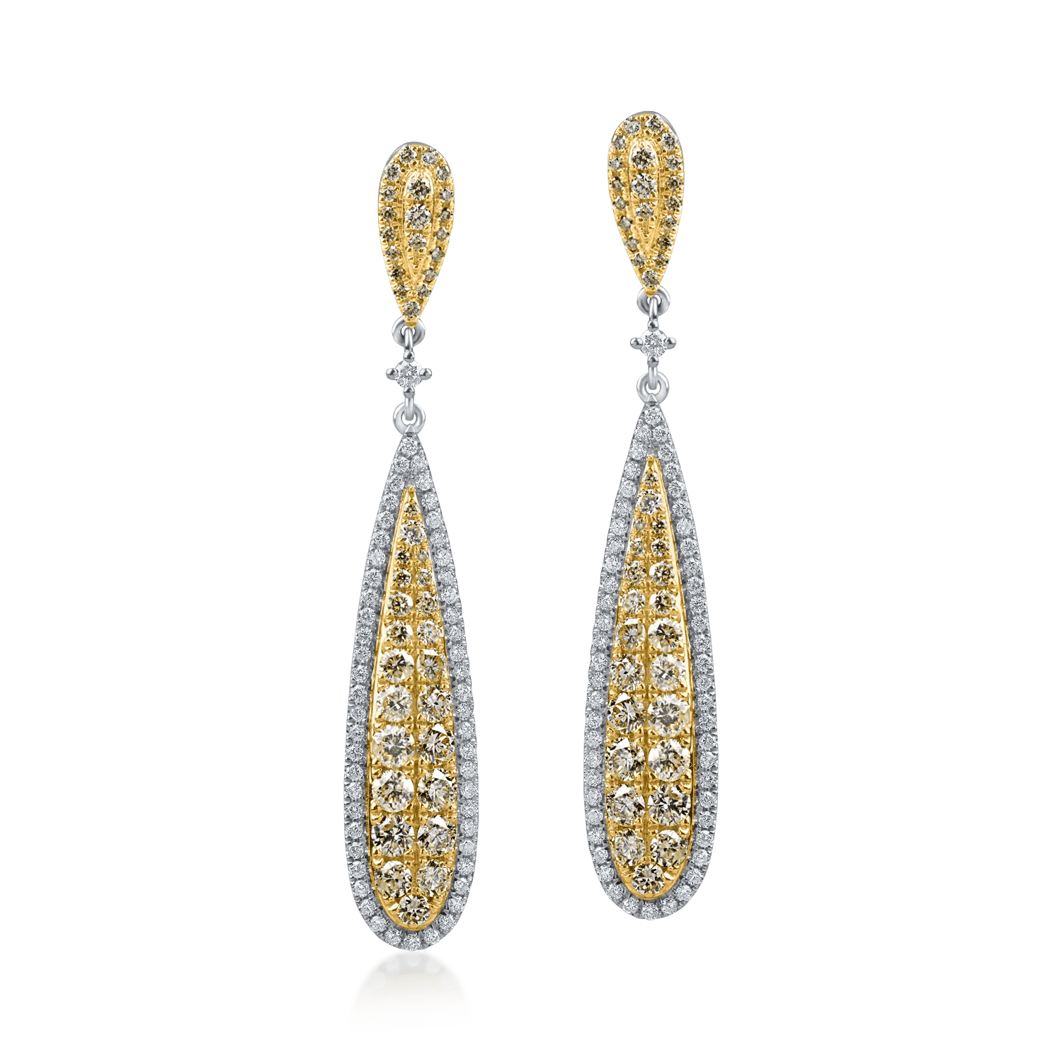 Acești cercei lungi din aur alb-galben sunt împodobiți cu diamante galbene și incolore de 1.8ct, aducând un rafinament special oricărei ținute. Perfecți pentru evenimente elegante sau pentru a aduce un plus de stil în zilele obișnuite.
