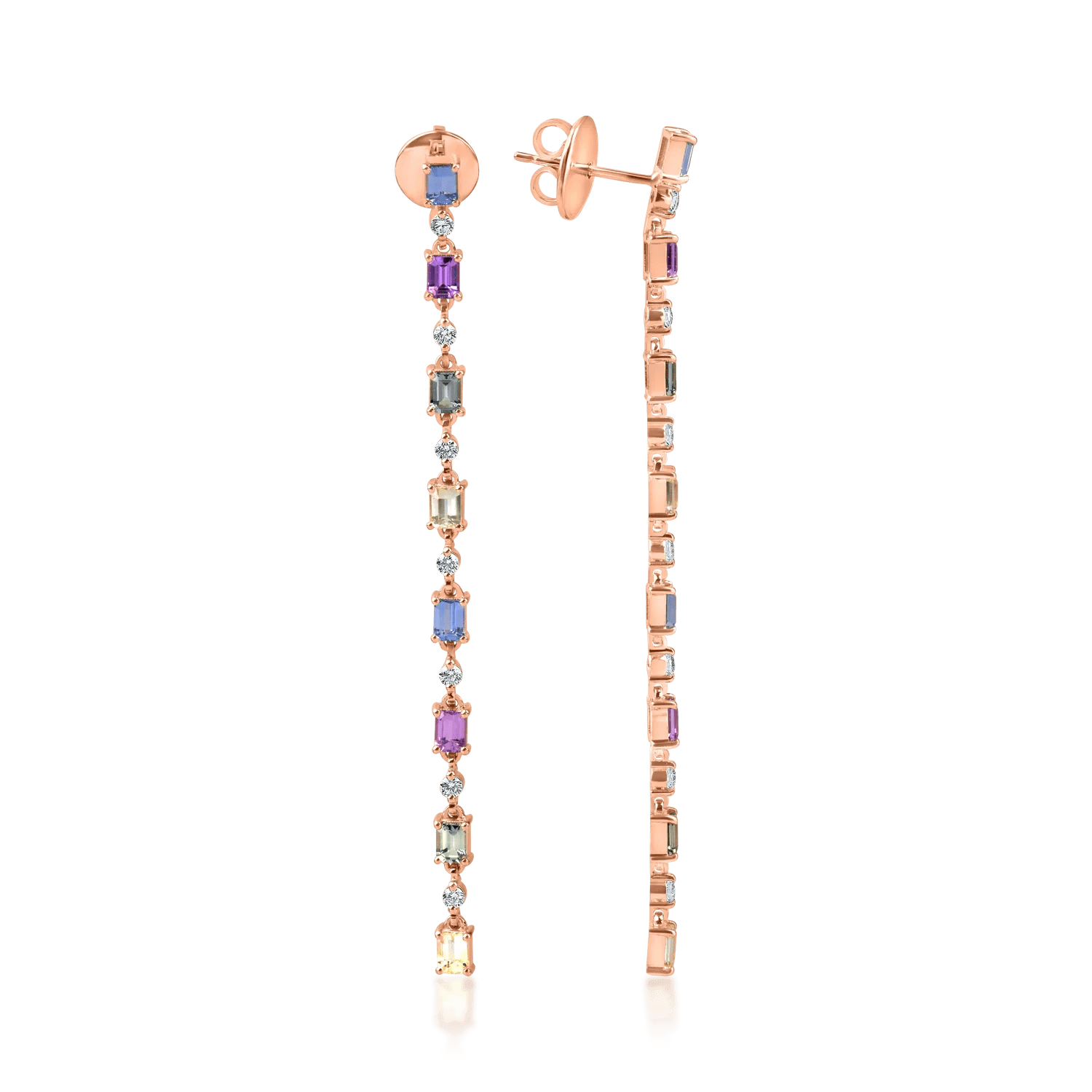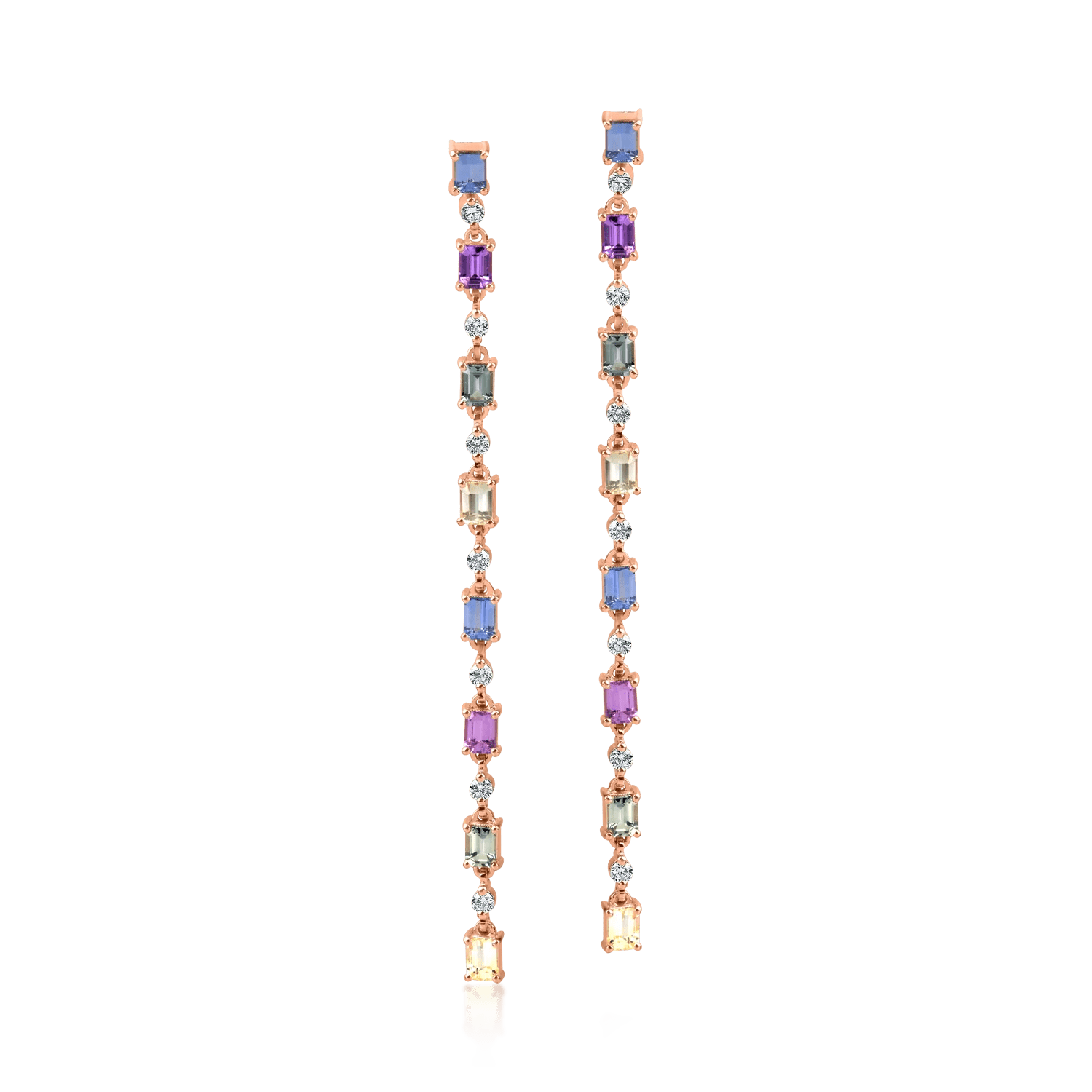 Experimentează strălucirea și rafinamentul cu acești cercei lungi din aur roz, înfrumusețați de safire multicolore octogonale de 4.2ct. Diamantele de 0.5ct adaugă un plus de eleganță, completând designul ce îmbină armonios stilurile modern și clasic.