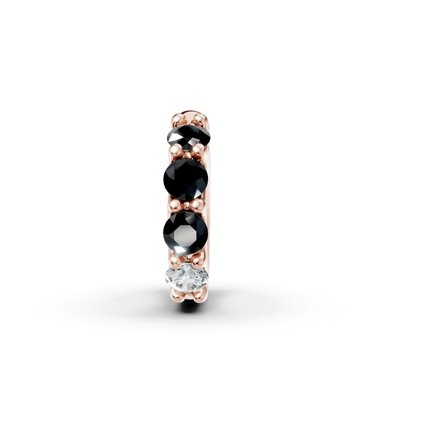 Acest cercel din aur roz, împodobit cu diamante negre de 0.38ct și un diamant transparent de 0.1ct, completează elegant orice ținută. Designul său atemporal subliniază feminitatea, oferind un plus de savoare prin nuanțele sale strălucitoare.