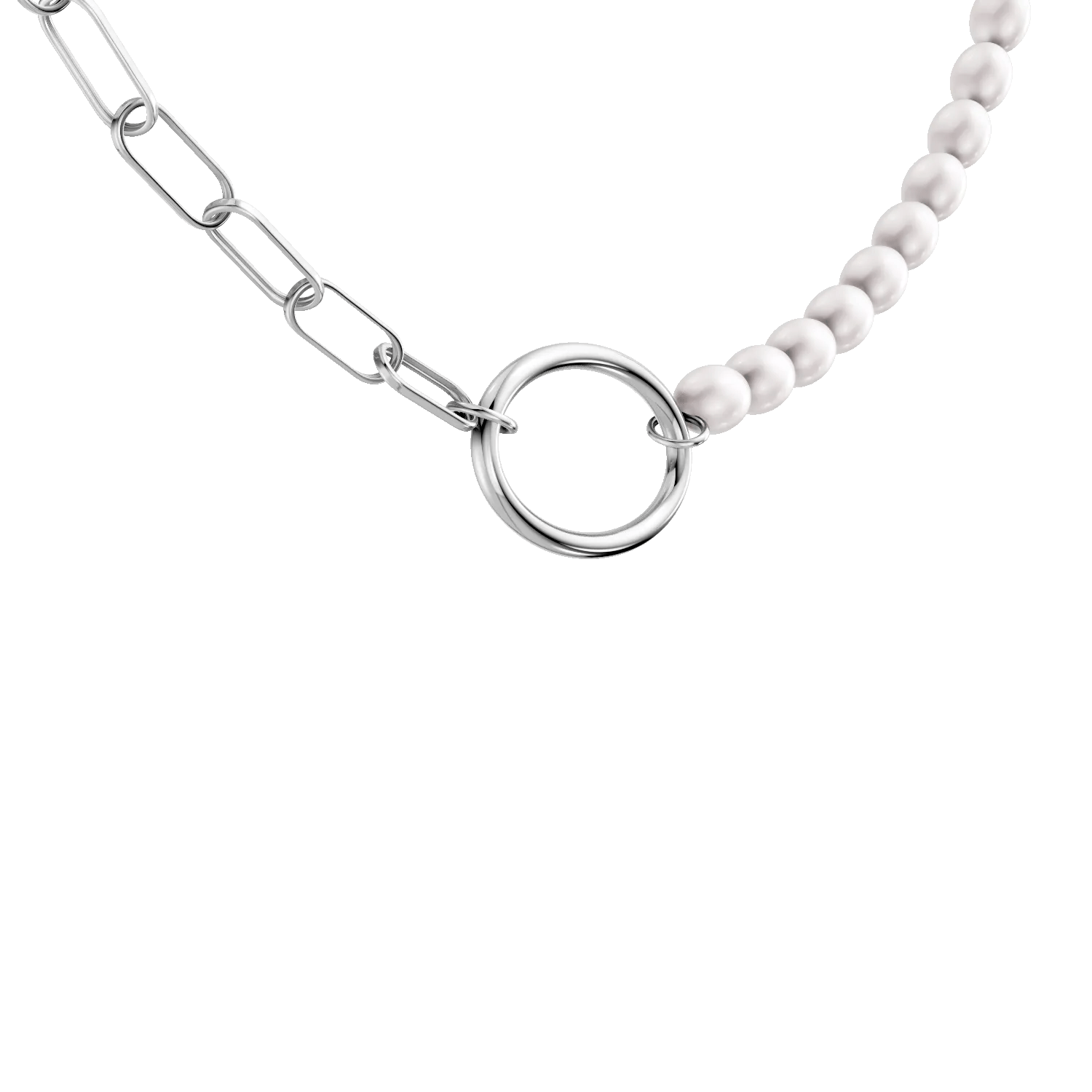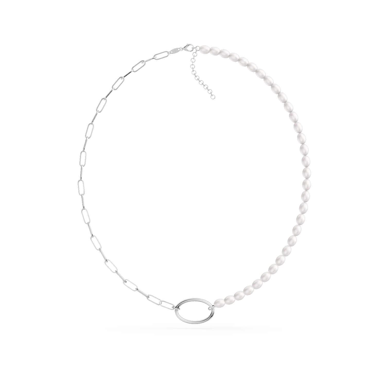 Acest colier elegant din aur alb este decorat cu perle naturale, oferind un contrast rafinat între luciul metalului și strălucirea delicată a perlelor. Designul său modern îl face versatil, ideal pentru ținute business sau evenimente speciale.