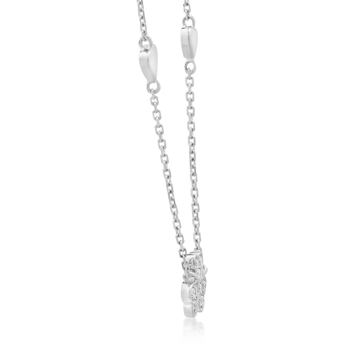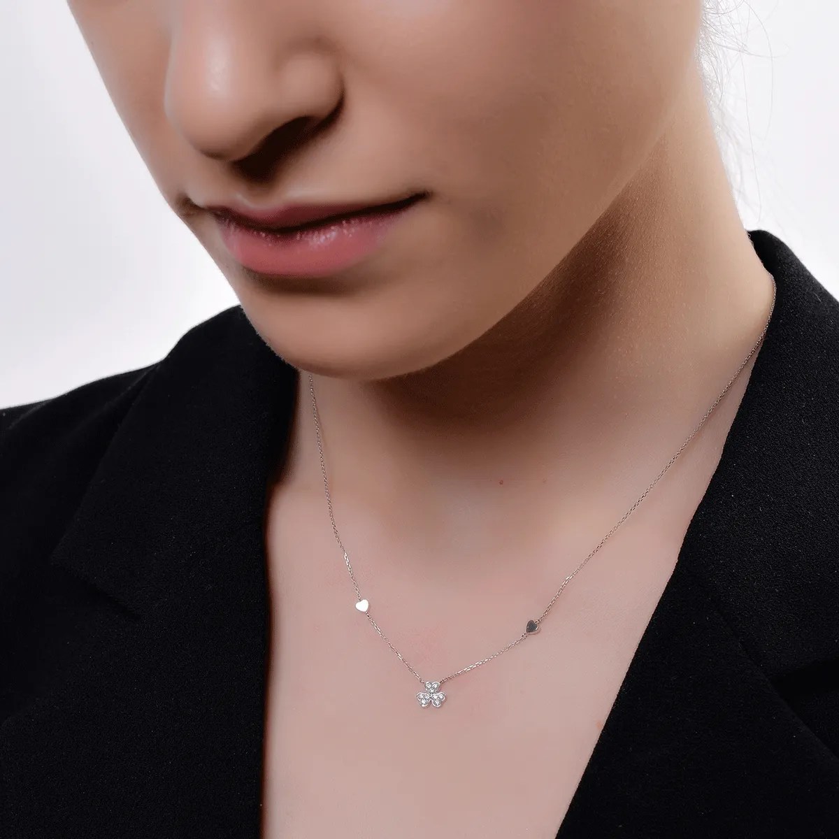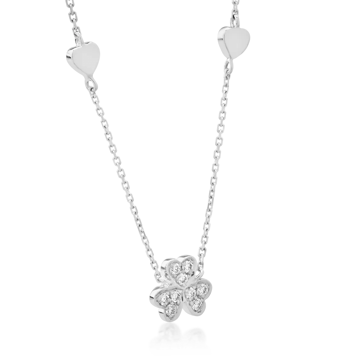 Acest colier din aur alb cu trifoi și inimioare este discret decorat cu diamante de 0.061ct, îmbinând simboluri ale norocului și iubirii. Perfect pentru a adăuga un strop de rafinament ținutelor zilnice, designul său sofisticat reușește să capteze lumina într-un mod unic, creând un efect memorabil.