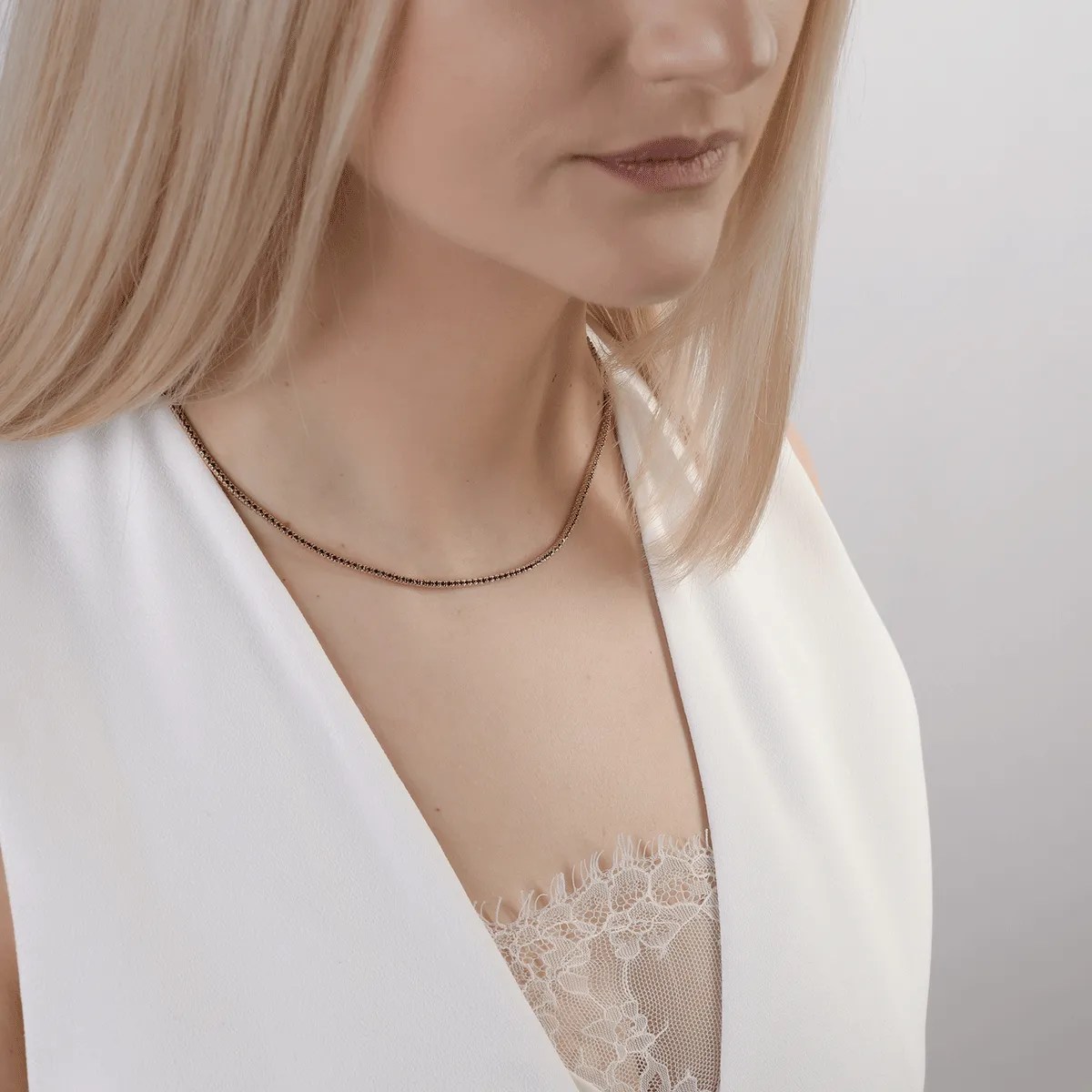 O bijuterie care pune în valoare eleganța și rafinamentul, colierul tennis din aur roz combină tonurile calde ale metalului cu strălucirea intensă a diamantelor negre. Cu o greutate de 2.2ct, acest colier aduce un plus de mister fiecărei ținute.