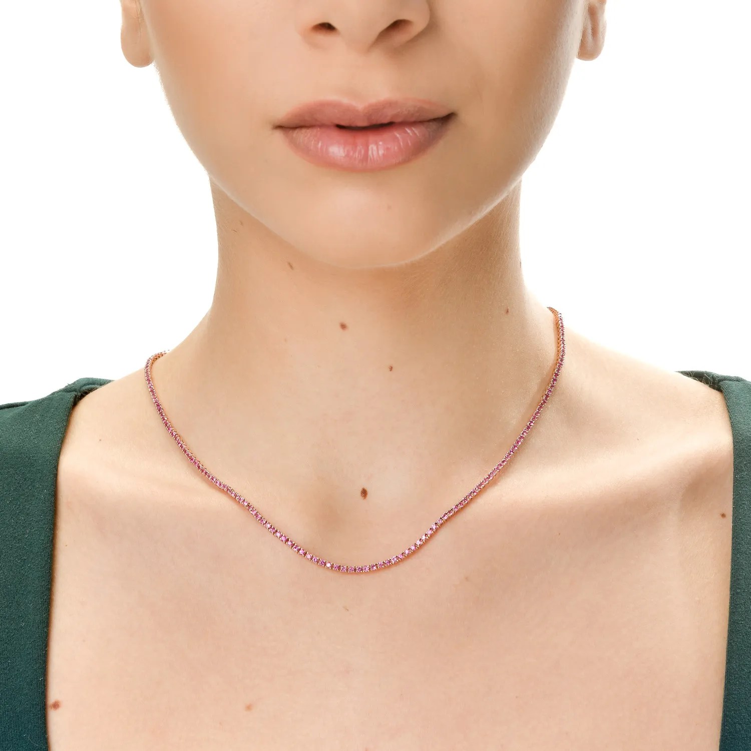 Alege un colier tennis din aur roz, cu safire roz de 5ct, pentru un efect deosebit. Fiecare piatră este montată cu precizie, oferind o strălucire continuă, în timp ce nuanțele de roz adaugă un rafinament romantic și sofisticat.