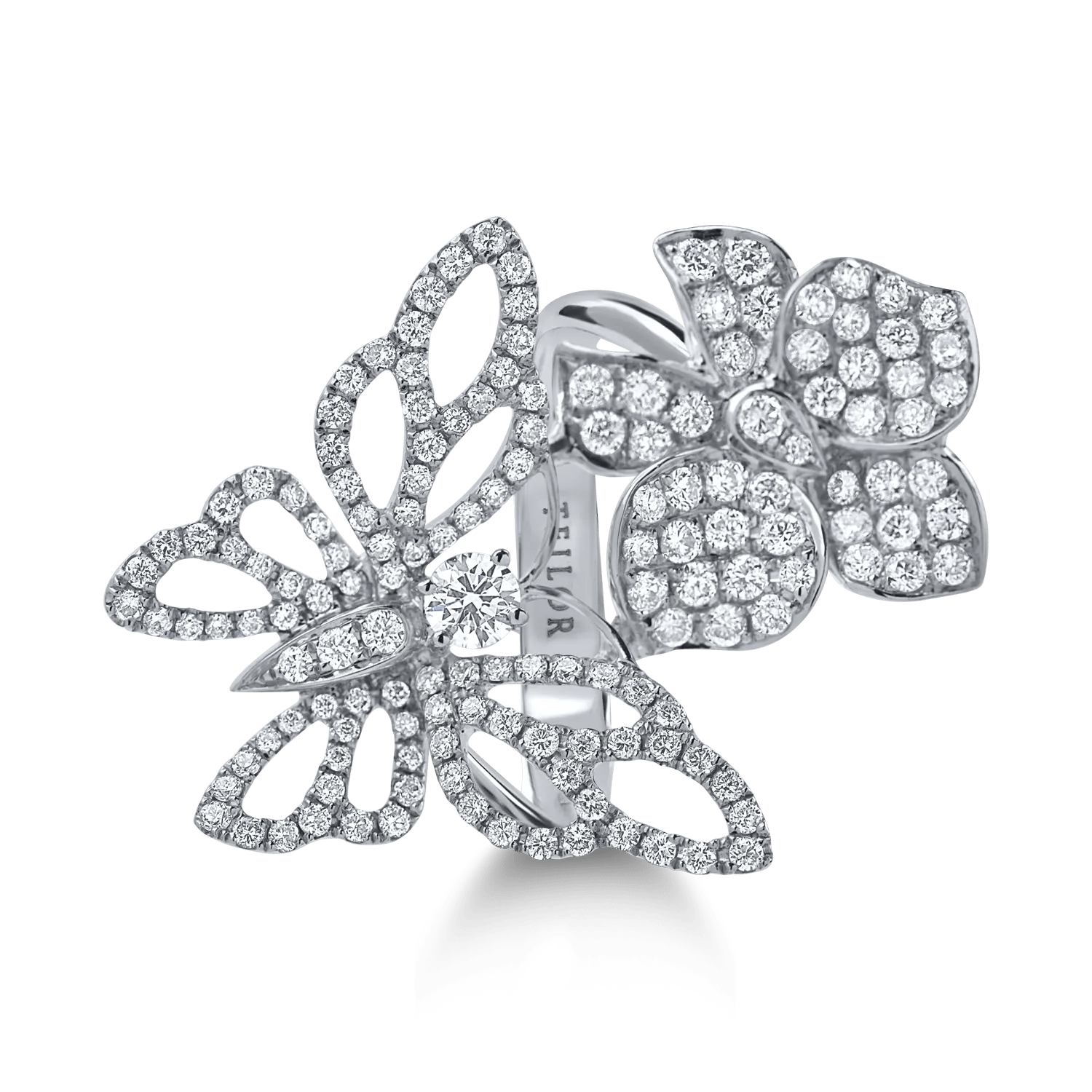 Experimentează eleganța cu acest inel unic din aur alb, decorat cu un design fluture-floare și diamante impresionante de 1.4ct. Un accesoriu perfect pentru a-ți evidenția stilul zilnic.