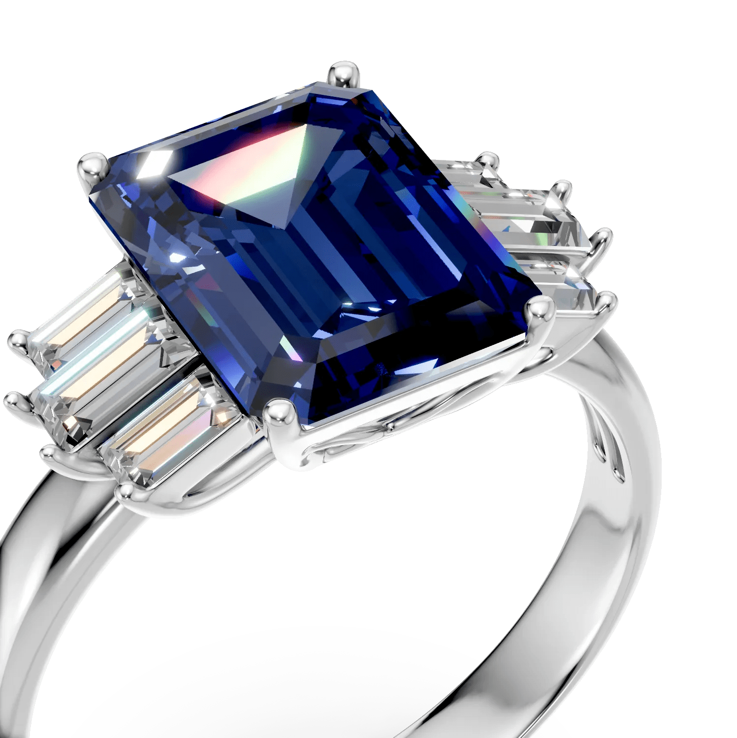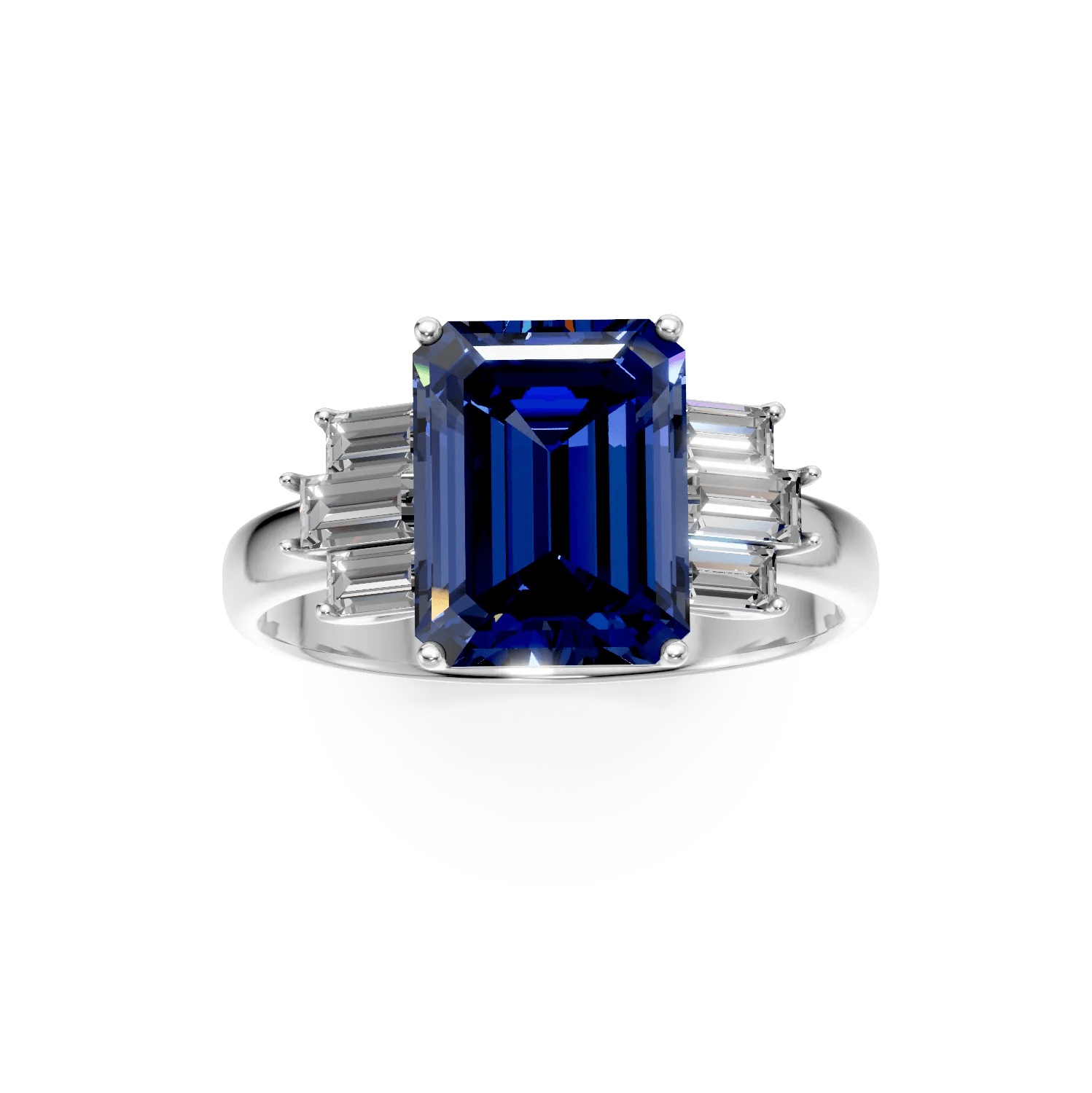 Acest inel din aur alb, împodobit cu un tanzanit de 3.9ct cu tăietură rectangulară, este accentuat de diamante de 0.5ct. Designul său elegant și detaliile rafinate subliniază culoarea profundă a tanzanitului și strălucirea metalului prețios.