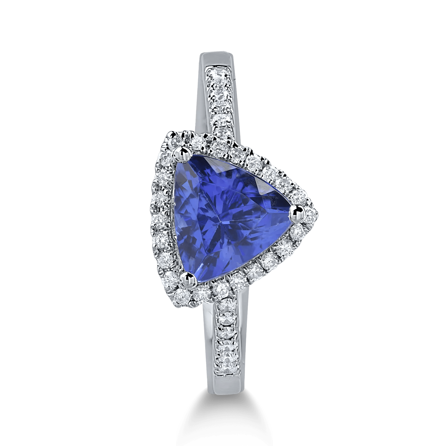 Acest inel realizat din aur alb, cu un tanzanit tăiat trillion de 1.4ct și diamante de 0.19ct, iese în evidență prin designul său geometric și jocul spectaculos de lumini. Montura fină și tăietura triunghiulară subliniază culoarea unică a pietrei, oferind o eleganță contemporană.