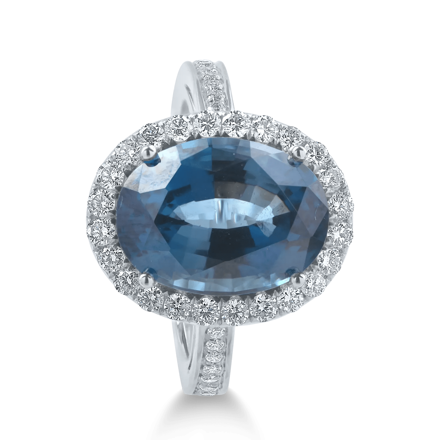 Acest inel din aur alb, cu un topaz London Blue de 7.8ct tăiat oval și diamante de 0.6ct, se remarcă prin profunzimea culorii. Tăietura ovală echilibrează lumina, punând în valoare nuanțele de albastru închis. Designul său elegant și modern completează orice ținută cu rafinament.