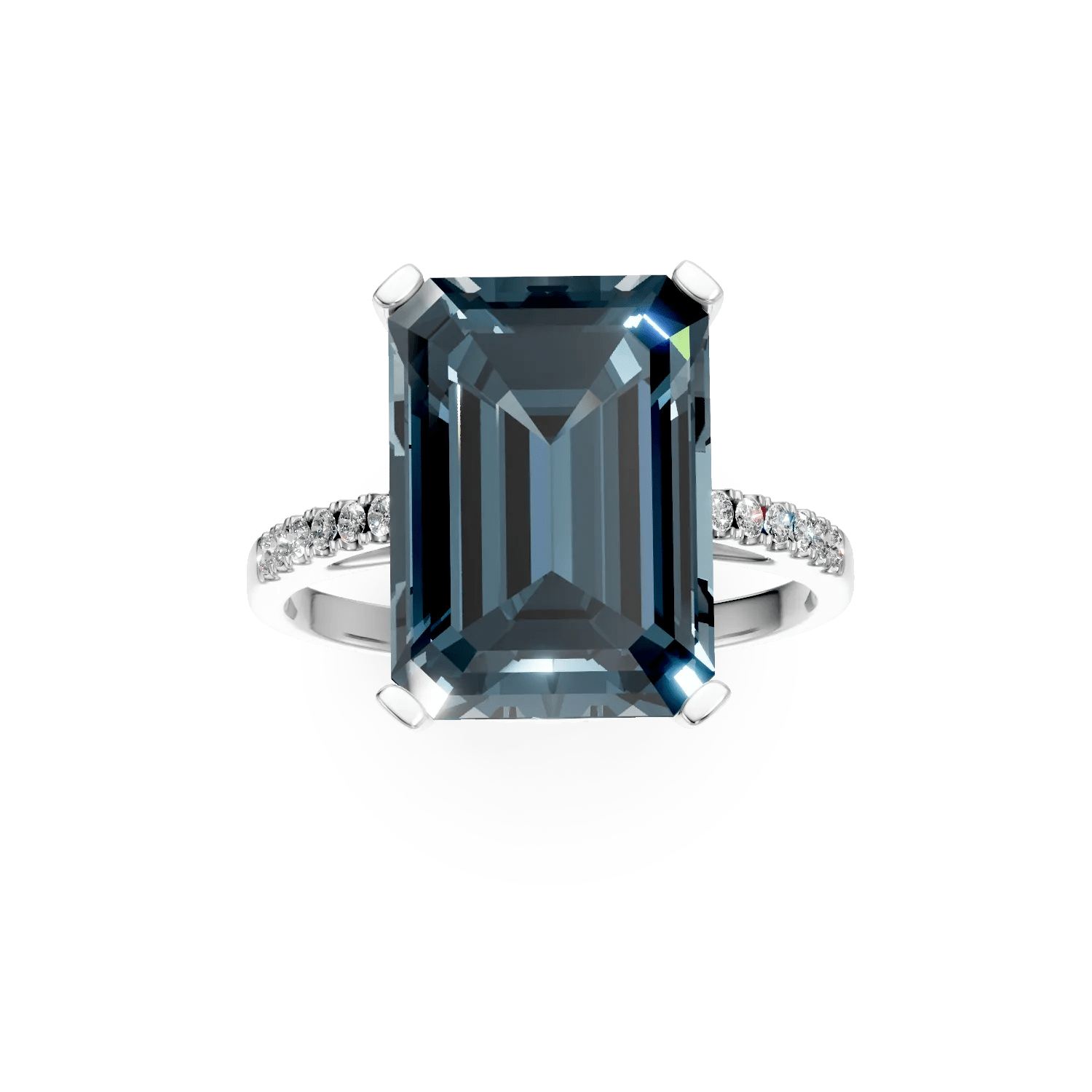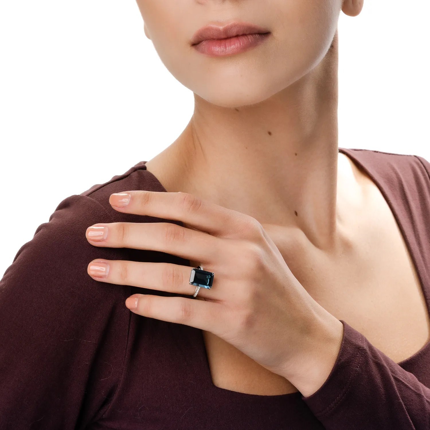 Acest inel din aur alb, modern și elegant, prezintă un topaz London Blue octogonal de 8.1ct și diamante de 0.1ct. Designul accentuează claritatea și profunzimea culorii, oferind un efect luminos și echilibrat. Reflexiile albastre adaugă un aer de mister, complementând stilurile clasice și contemporane.