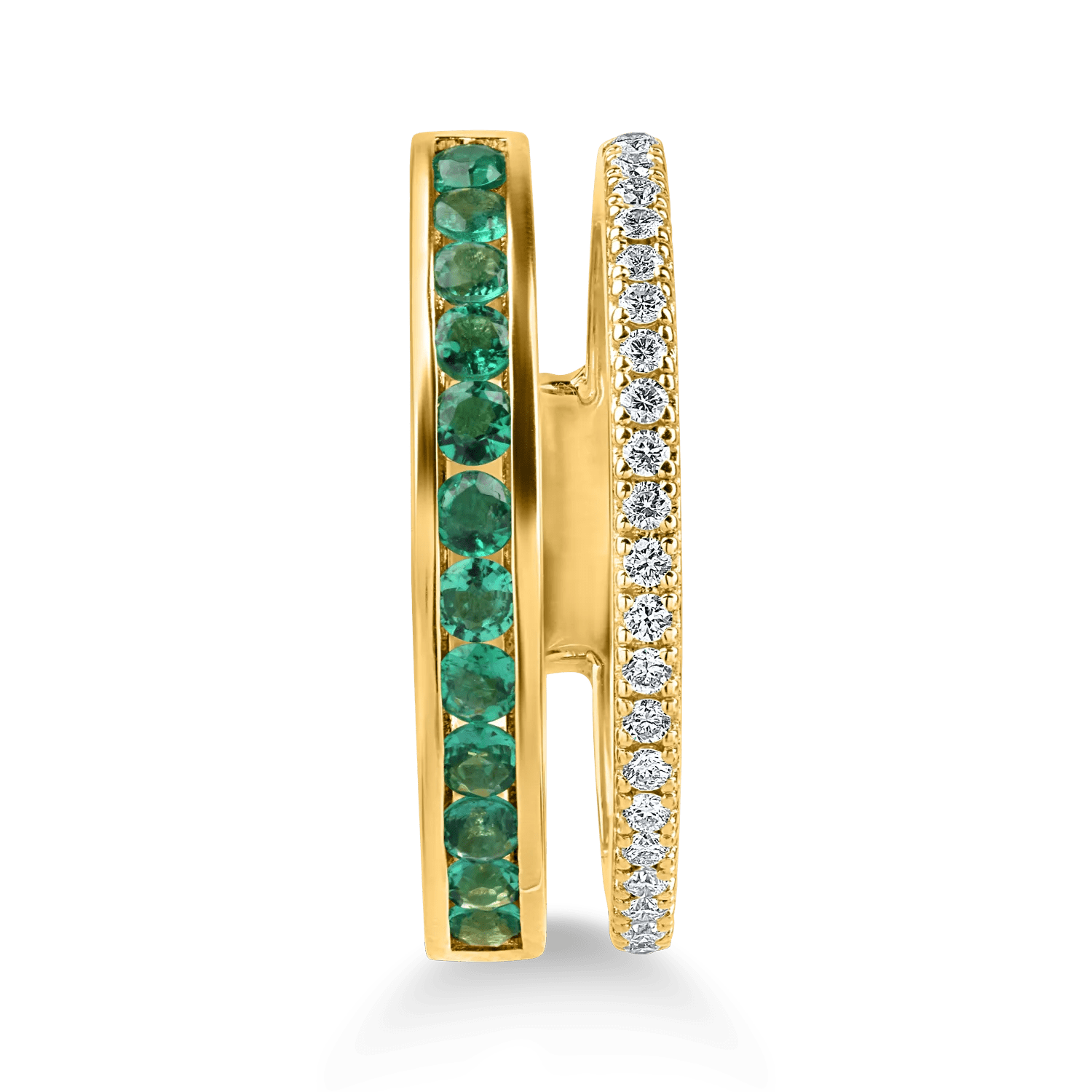 Această bijuterie din aur galben, împodobită cu smaralde princess de 0.46ct și diamante de 0.16ct, îmbină rafinamentul modern cu eleganța clasică. Contrastul dintre smaraldele verzi și diamantele strălucitoare crează un efect vizual de impact, completat de căldura aurului galben.