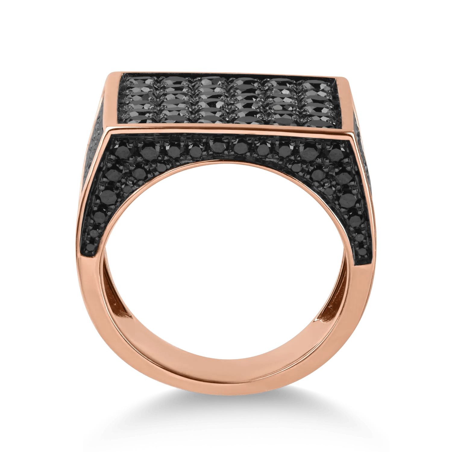 Inelul din aur roz, decorat cu diamante negre de 2.7ct, îmbină originalitatea și eleganța. Această bijuterie unică va evidenția stilul personal și va completa look-urile tale distinctive.