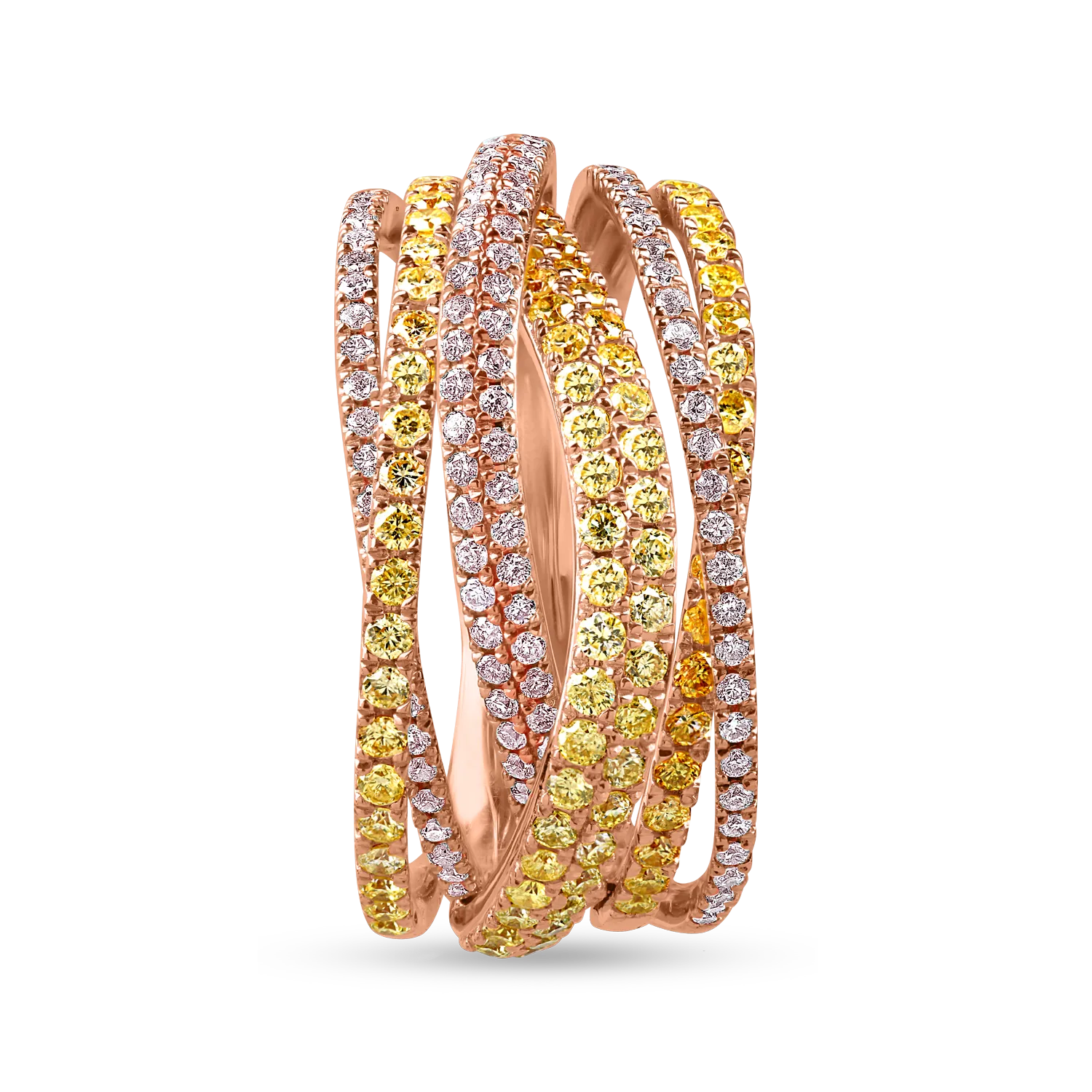 Dezvăluie feminitatea și atitudinea cu acest inel din aur roz, având diamante roz și galbene de 1.15ct. Designul său original îți evidențiază farmecul și adaugă o notă vibrantă ținutei tale.