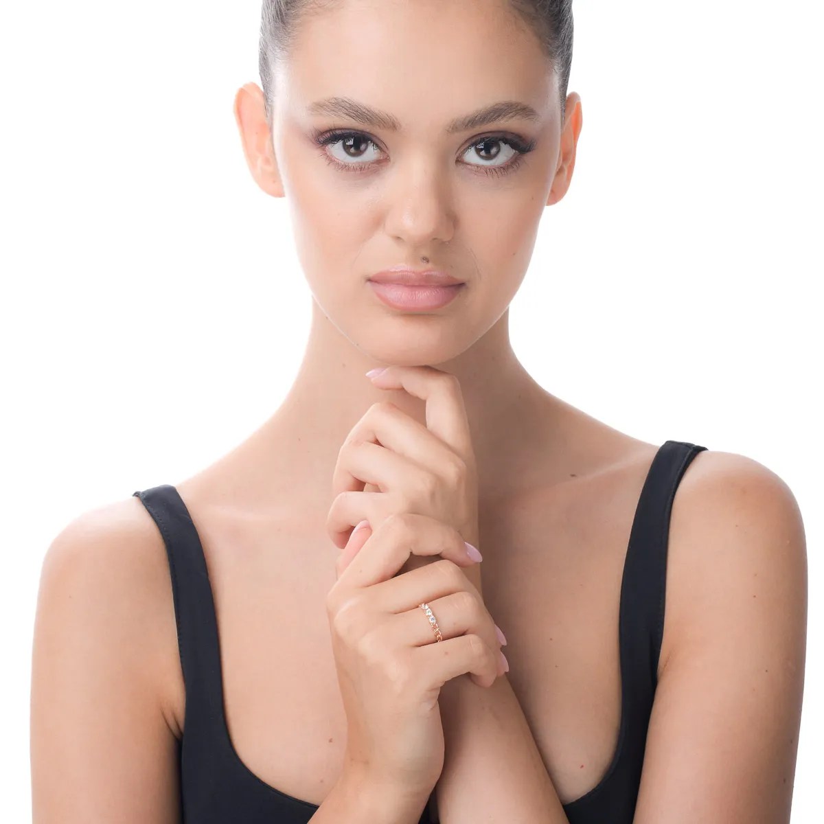Intră în lumea fascinantă TEILOR cu un inel din aur roz, decorat cu zirconii strălucitoare. Un accesoriu versatil, perfect pentru a accentua eleganța în orice context.