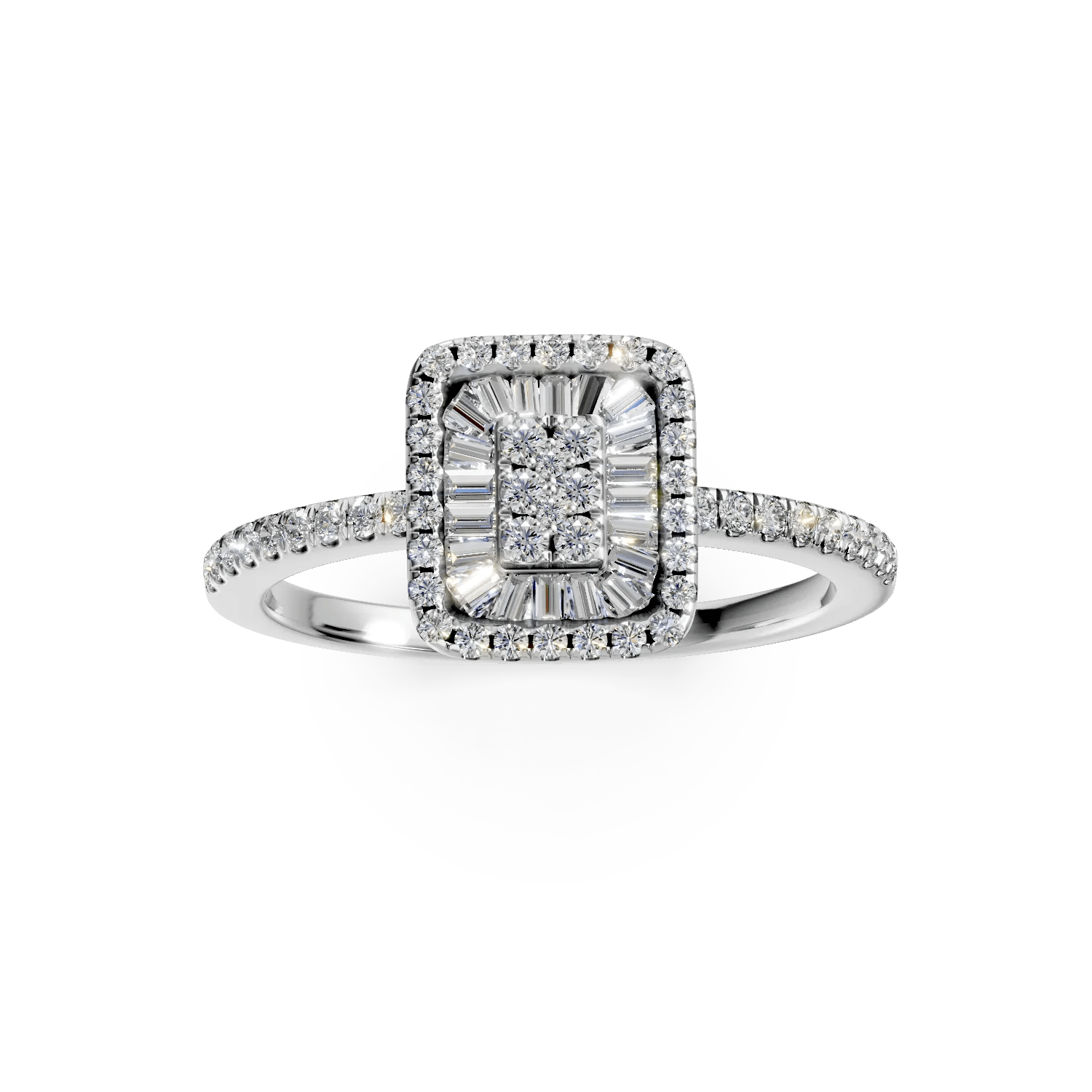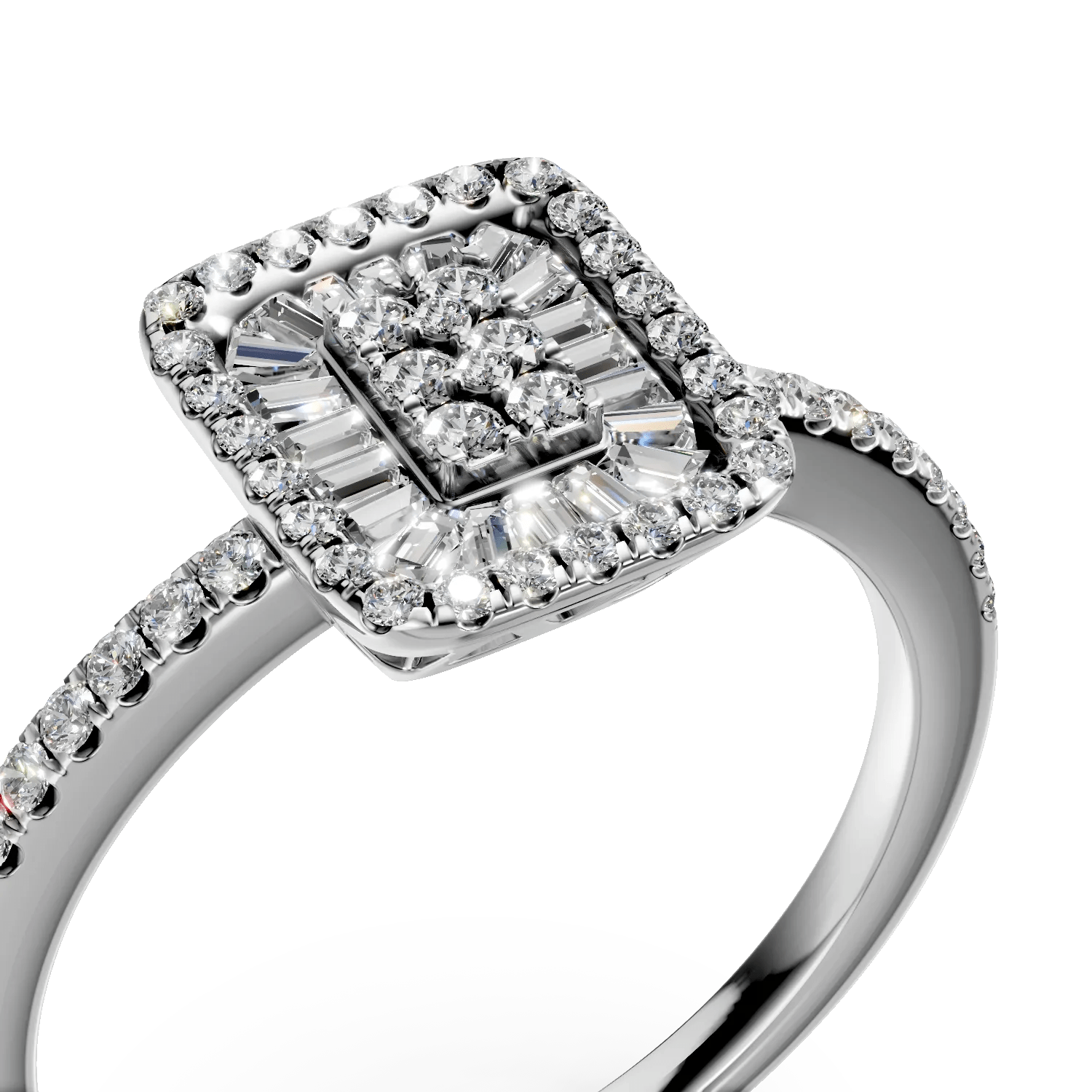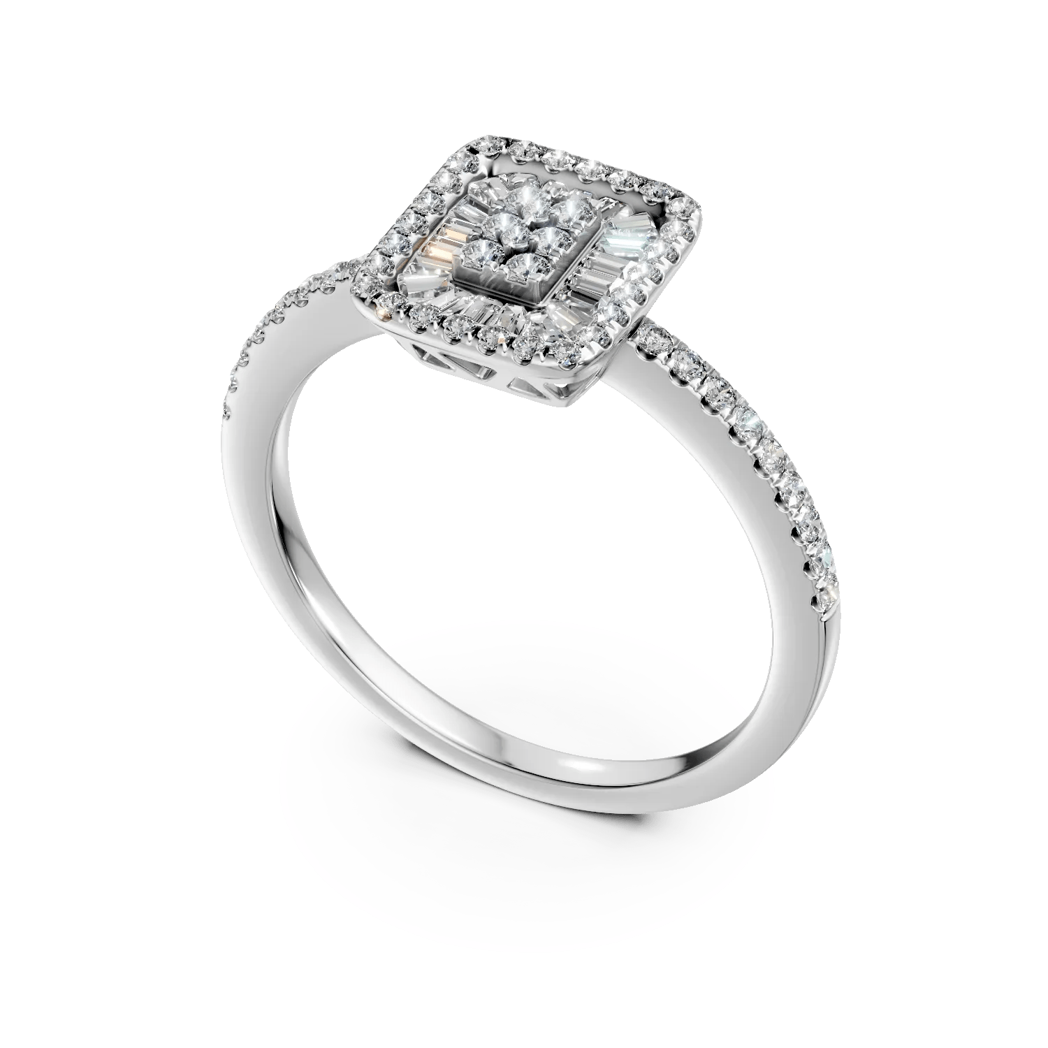 Alege rafinamentul pentru cererea în căsătorie cu acest inel de logodnă din aur alb, decorat cu diamante baguette și rotunde de 0.2ct. Designul său echilibrat pune în valoare strălucirea discretă a pietrelor.