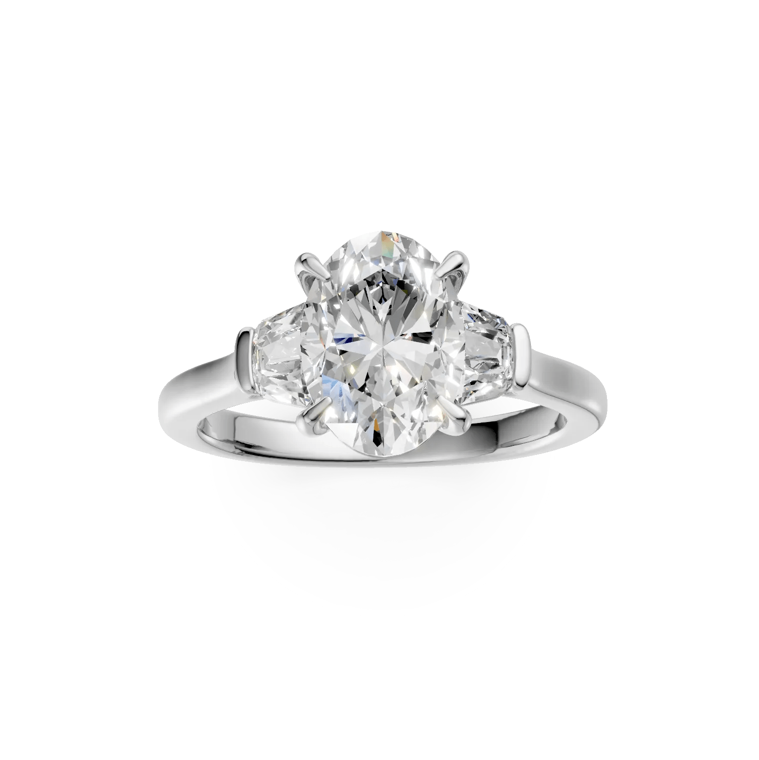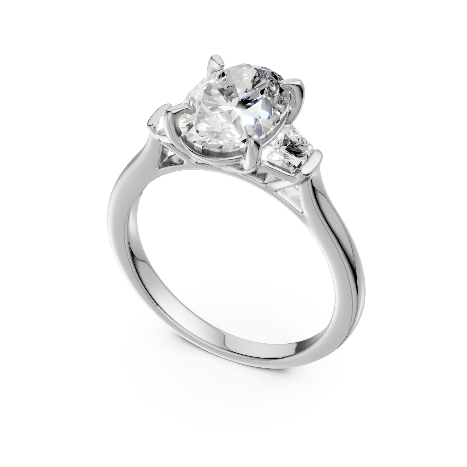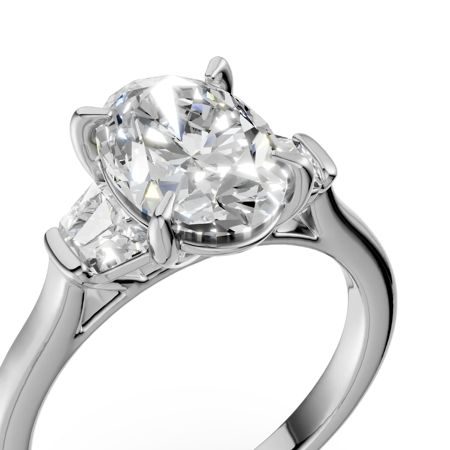 Inelul de logodnă din aur alb este împodobit cu diamante de 2ct, create în laborator, având tăieturi ovale și triangle care subliniază eleganța și iubirea eternă. Designul său clasic și echilibrat pune în valoare strălucirea detaliilor, fiind ușor de asortat cu orice verighetă din colecția TEILOR.
