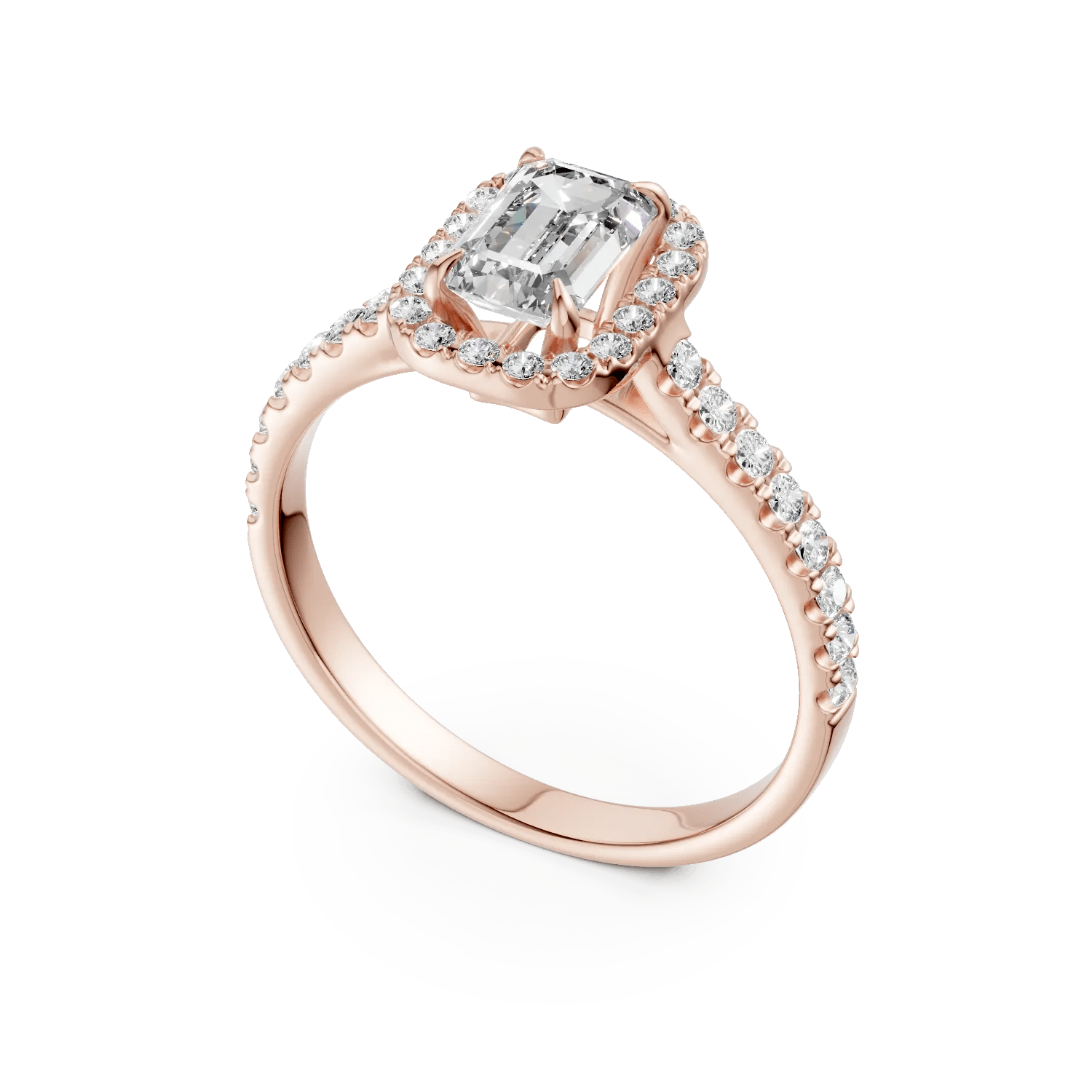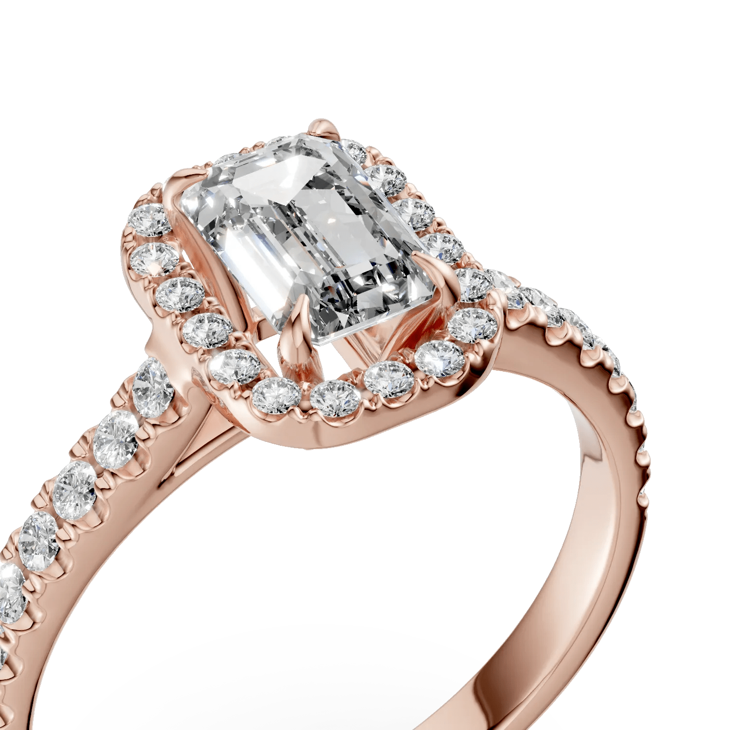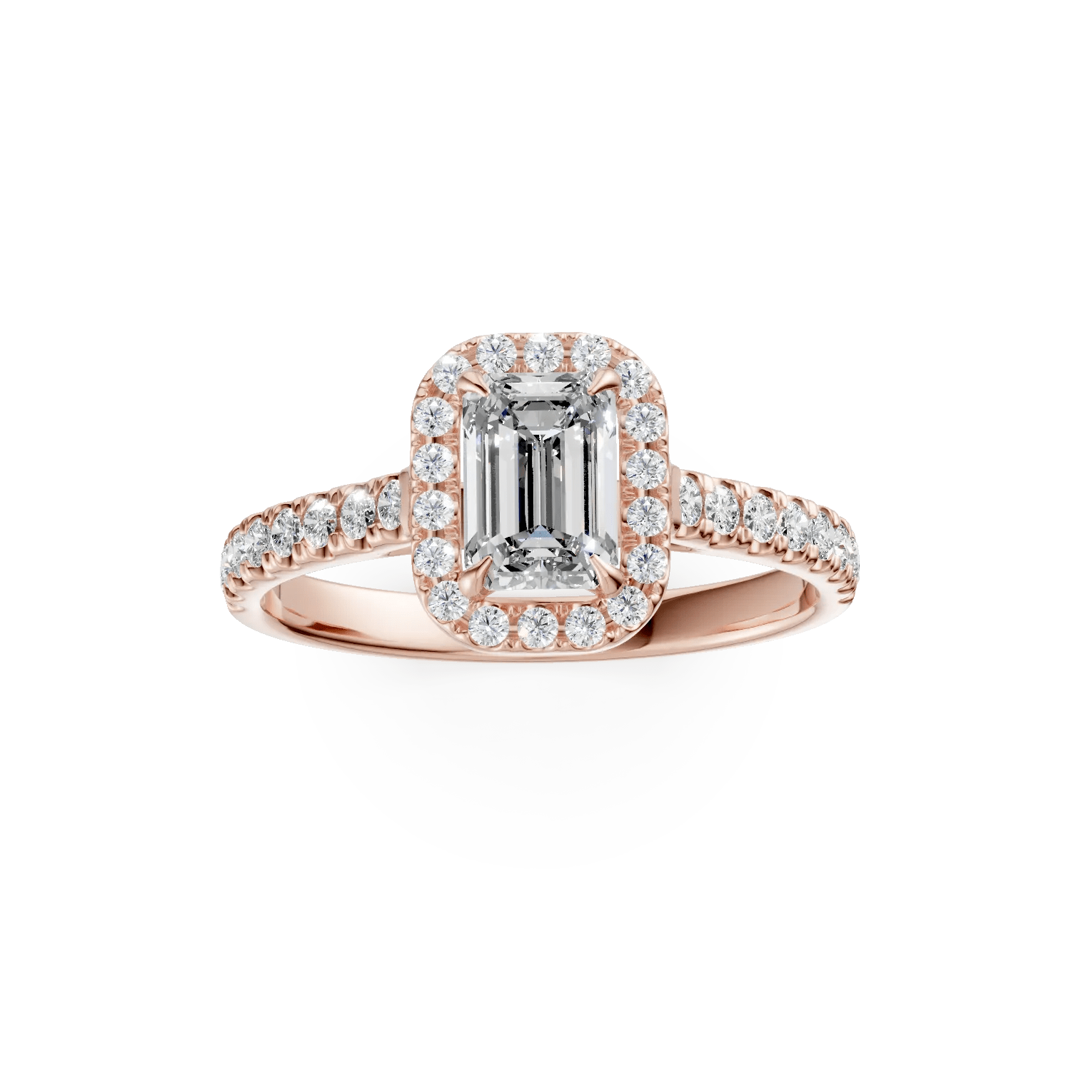 Acest inel de logodnă din aur roz, cu diamant tăiat emerald de 0.8ct și diamante de 0.3ct, face parte din colecția Love Stories. Tăietura emerald, cu fațete ample și linii clare, subliniază strălucirea subtilă și sofisticată a diamantului. Diamantul central al bijuteriei este însoțit de certificatul de autenticitate și calitate GIA.