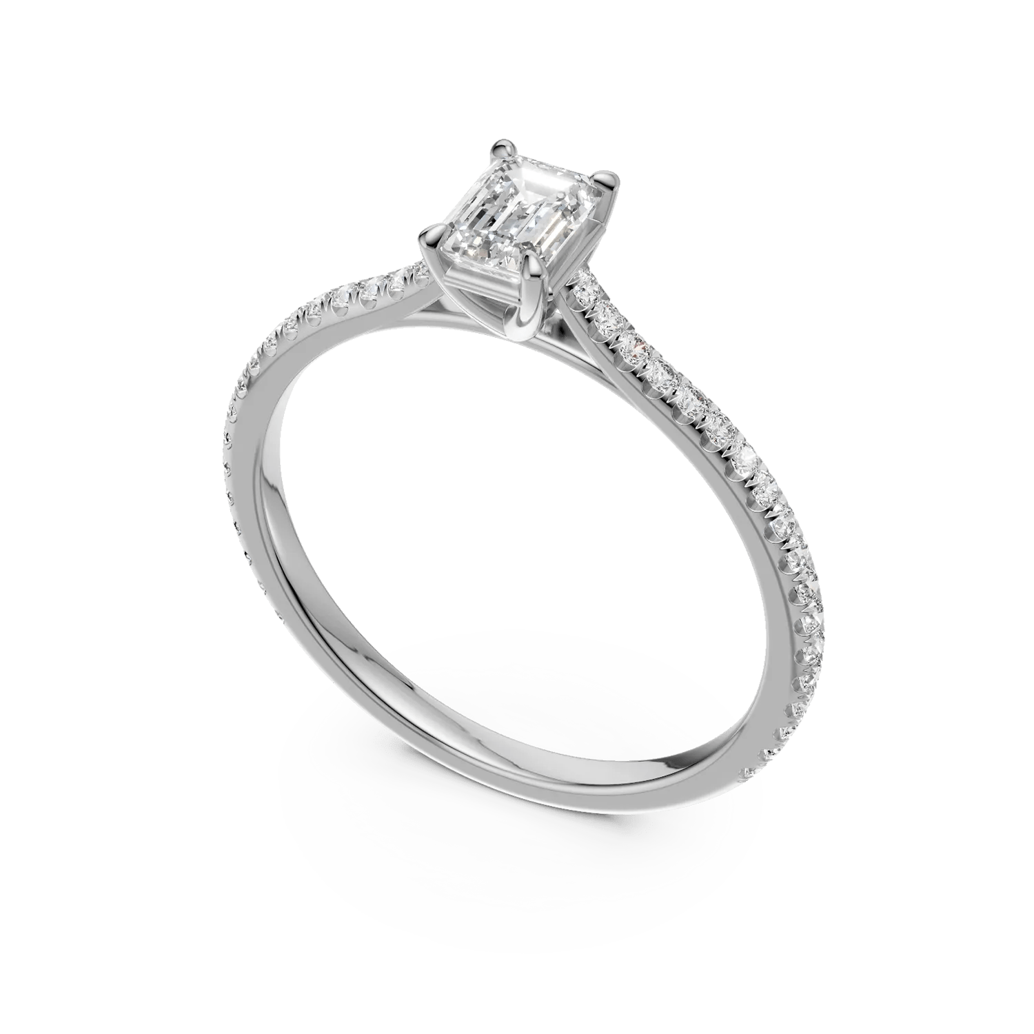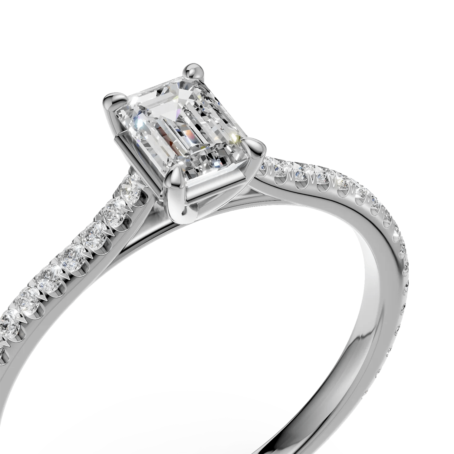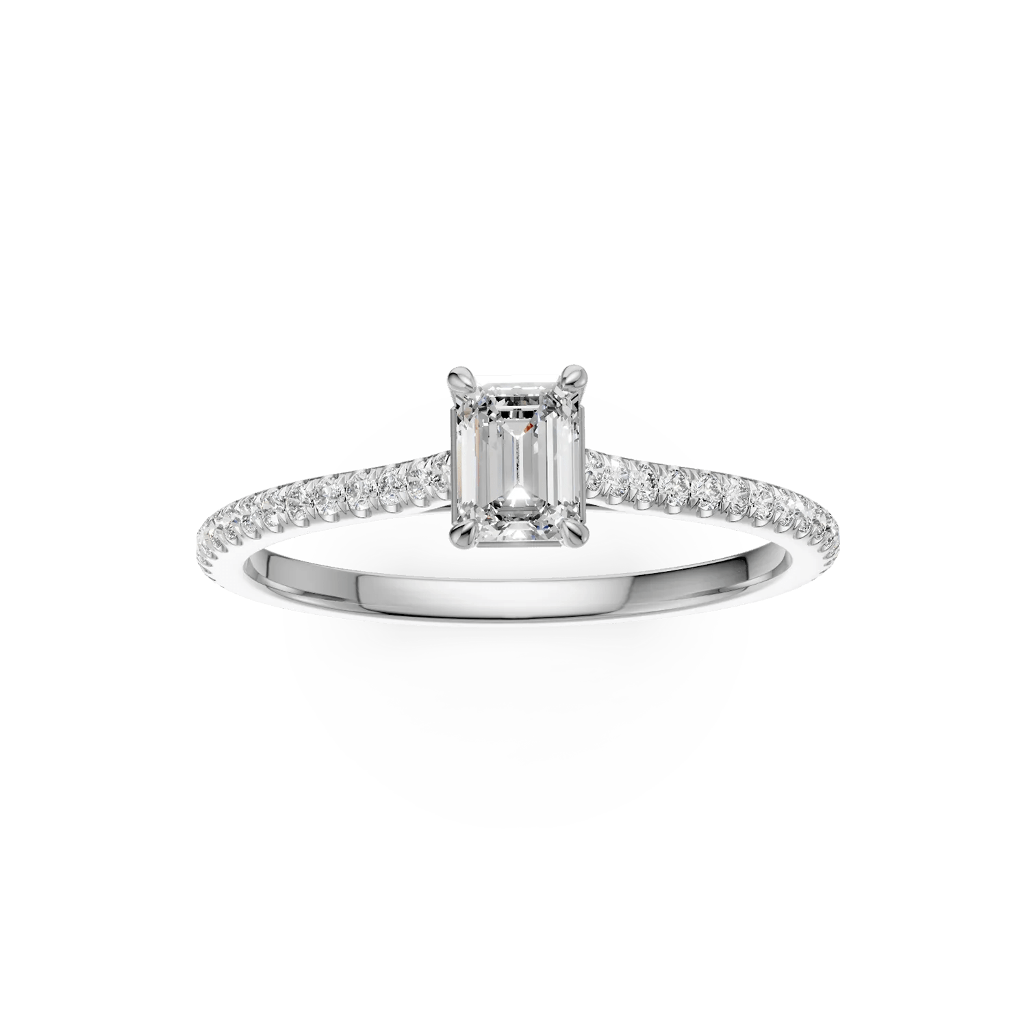 Inelul de logodnă din platină cu diamant emerald, de 0.19ct, alături de diamantele de 0.18ct, face parte din colecția Love Stories. Eleganța atemporală a tăieturii emerald este pusă în valoare de strălucirea diamantele laterale.